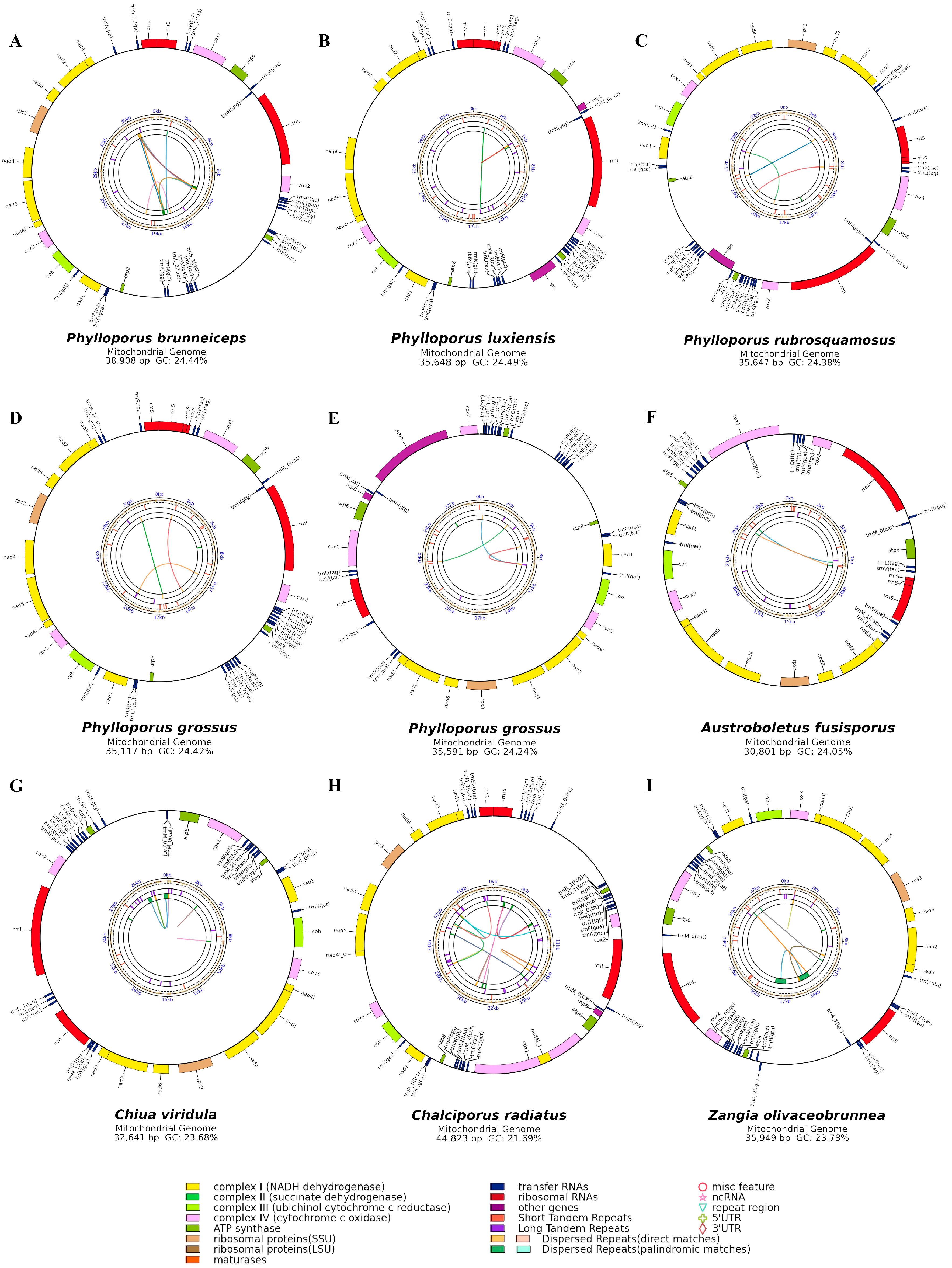 Figure 1. Circular maps of the nine mitogenomes from Boletaceae. (A) Phylloporus brunneiceps * HKAS105261; (B) Phylloporus luxiensis HKAS105263; (C) Phylloporus rubrosquamosus HKAS105259; (D) Phylloporus grossus HKAS105262; (E) Phylloporus grossus HKAS105260; (F) Austroboletus fusisporus HKAS105269; (G) Chiua viridula HKAS105270; (H) Chalciporus radiatus HKAS105264; (I) Zangia olivaceobrunnea HKAS105268). Each gene is represented by a corresponding colored block. Colored blocks outside the ring indicate genes located on the direct strand, while those inside the ring represent genes on the reverse strand. Colored lines for intraspecies collinearity analysis.