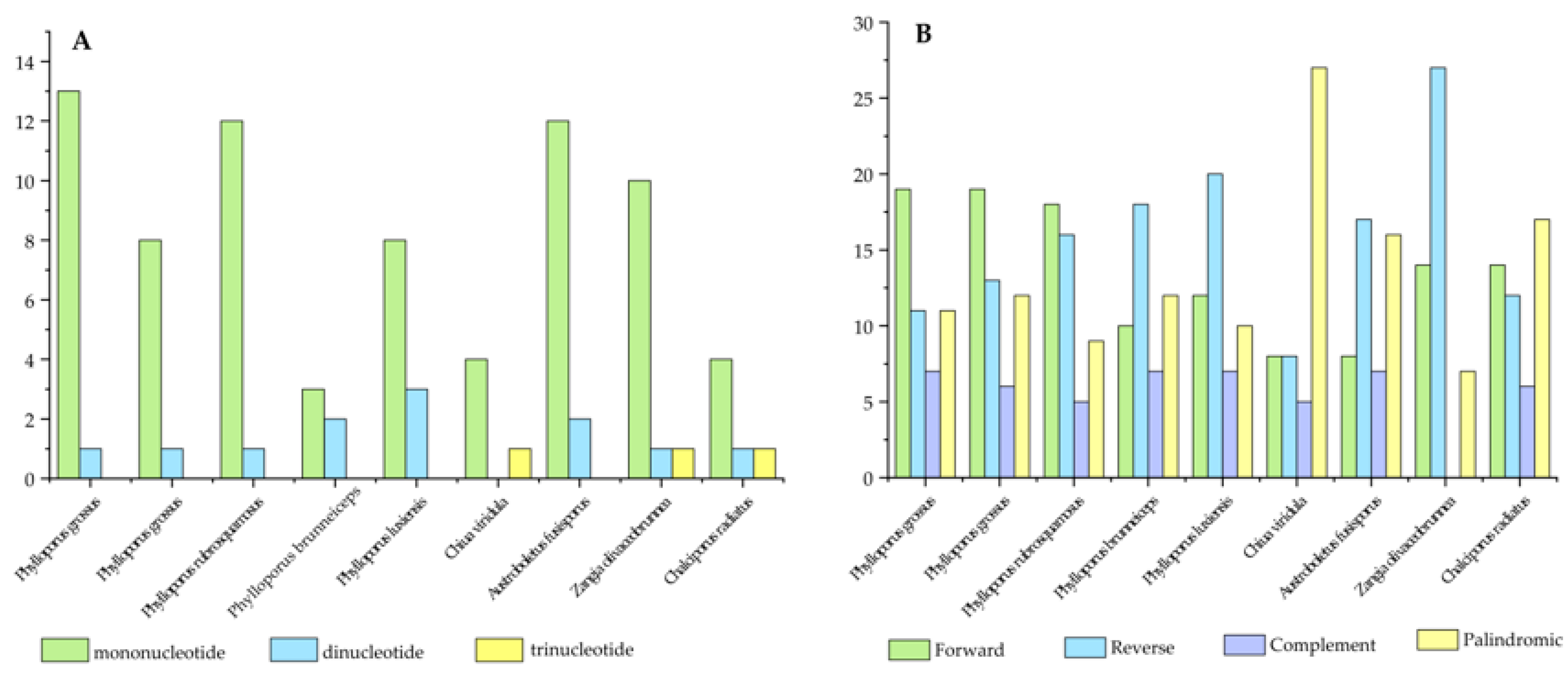 Figure 2. (A) Short tandem repeats and (B) dispersed repeats in the mitogenomes of the nine Boletaceae specimens.