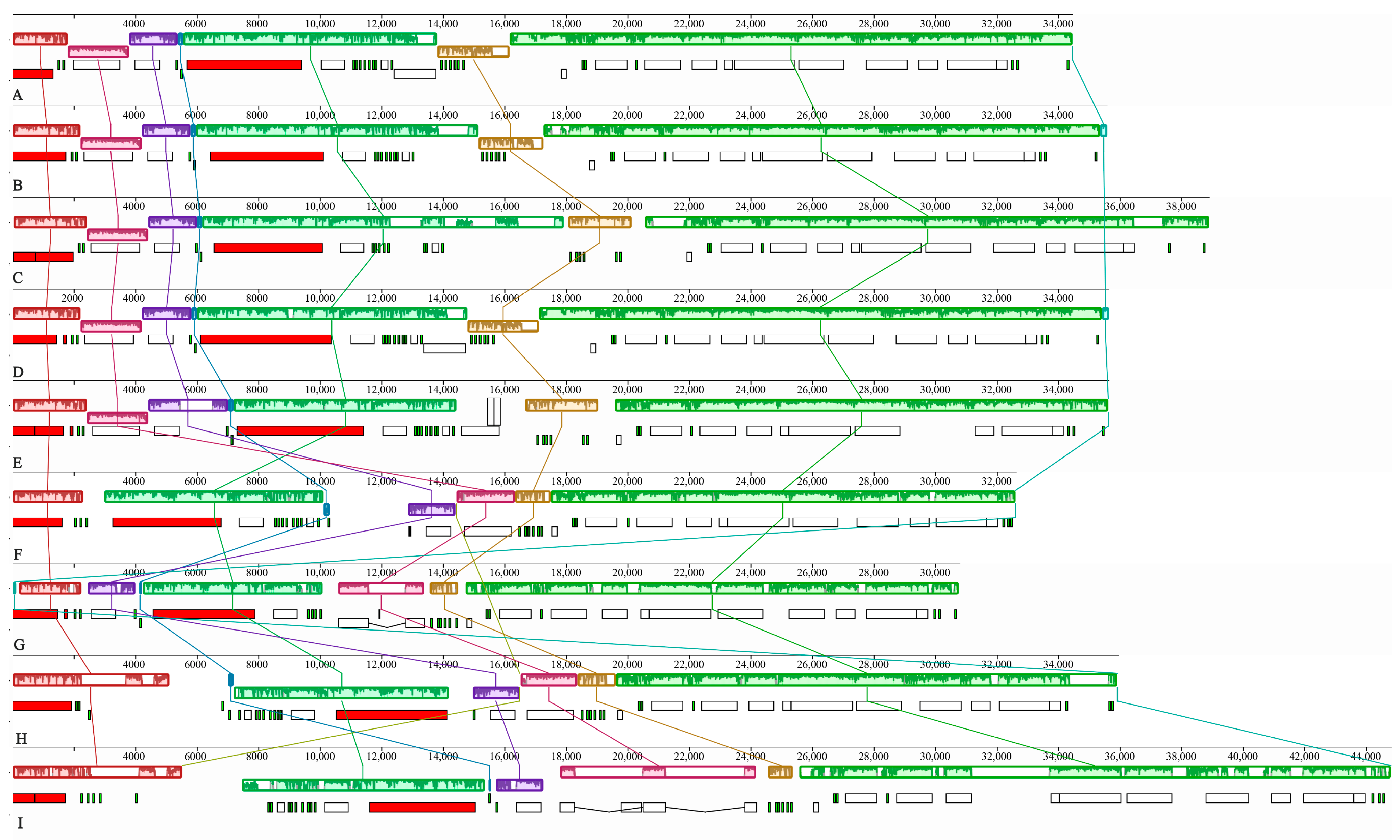 Figure 3. Collinear analysis of mitogenomes in Boletaceae. The colored rectangles beneath the homologous blocks represent the positions and lengths of different types of genes. The same-origin sections are connected by lines of corresponding colors. (A) Phylloporus grossus HKAS105262; (B) Phylloporus grossus HKAS105260; (C) Phylloporus brunneiceps HKAS105261; (D) Phylloporus rubrosquamosus HKAS105259; (E) Phylloporus luxiensis HKAS105263; (F) Chiua viridula HKAS105270; (G) Austroboletus fusisporus HKAS105269; (H) Zangia olivaceobrunnea HKAS105268; (I) Chalciporus radiatus HKAS105264.