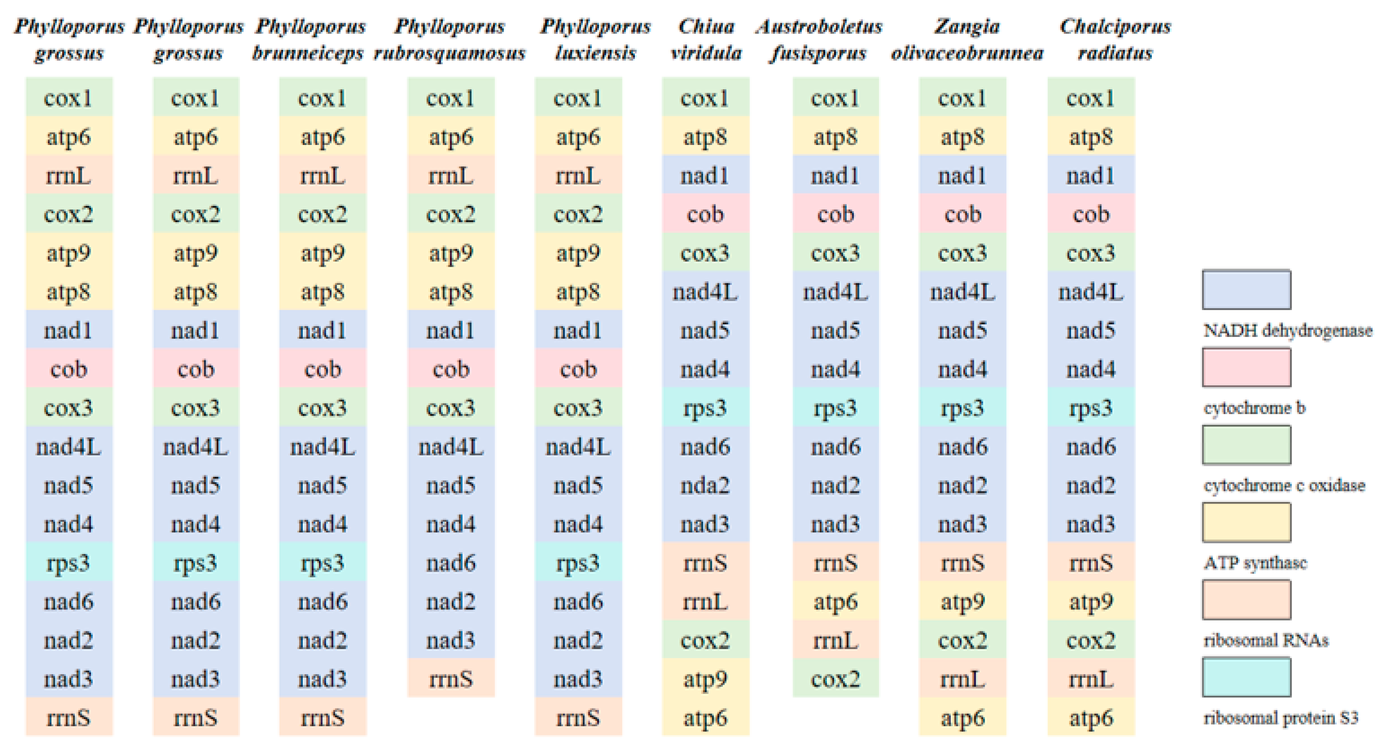 Figure 4. Gene order analysis in nine specimens of Boletaceae collected from Jiangxi Province. Each colored block represents a distinct type of gene. A total of 14–15 PCGs and 2 rRNA genes were used in this analysis.