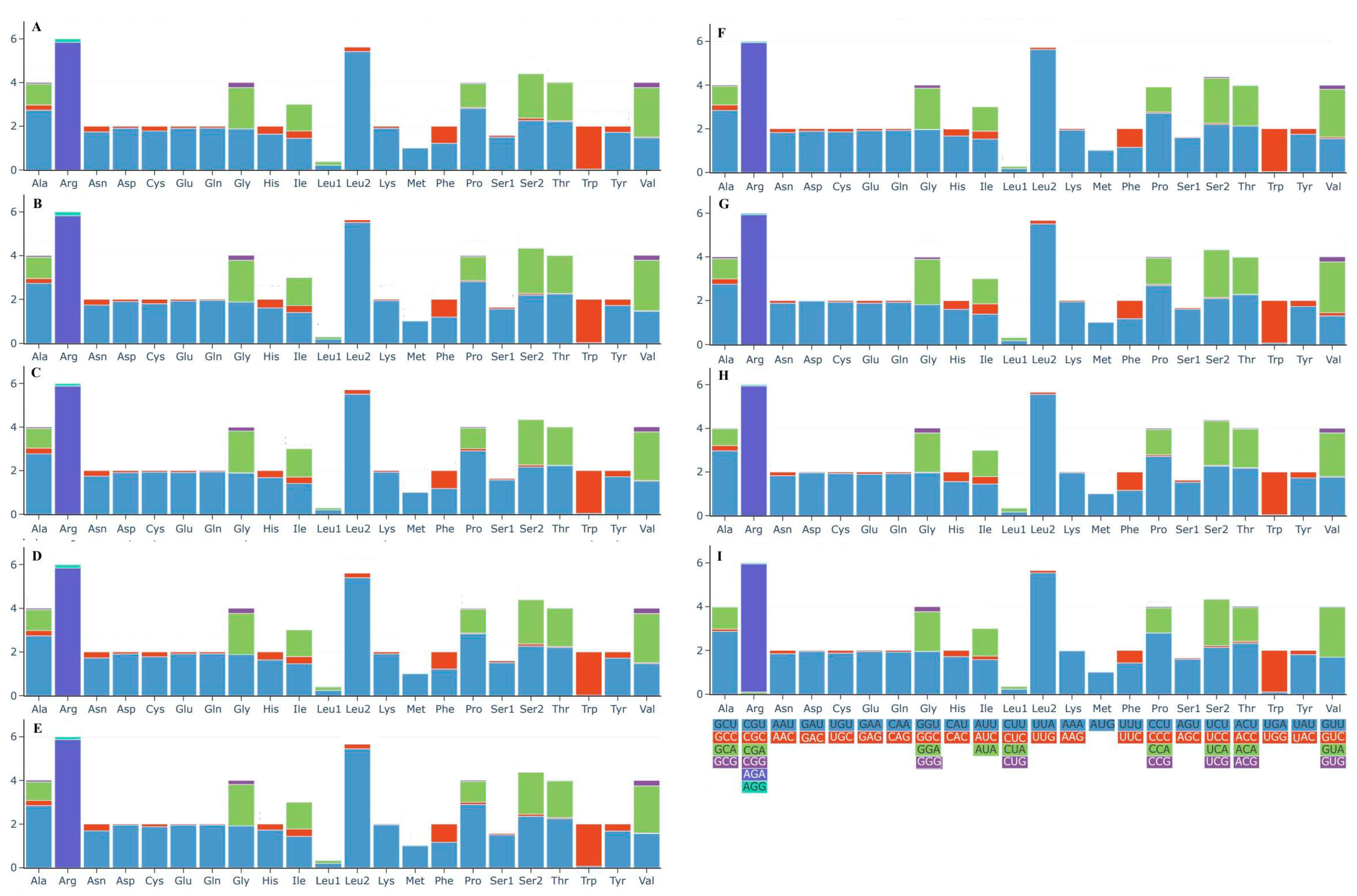 Figure 5. Codon usage in the mitogenomes of the nine Boletaceae specimens. Frequency of codon usage is plotted on the y-axis. Different colors respectively represent the corresponding codons. (A) Phylloporus grossus HKAS105262; (B) Phylloporus grossus HKAS105260; (C) Phylloporus brunneiceps HKAS105261; (D) Phylloporus rubrosquamosus HKAS105259; (E) Phylloporus luxiensis HKAS105263; (F) Chiua viridula HKAS105270; (G) Austroboletus fusisporus HKAS105269; (H) Zangia olivaceobrunnea HKAS105268; (I) Chalciporus radiatus HKAS105264.