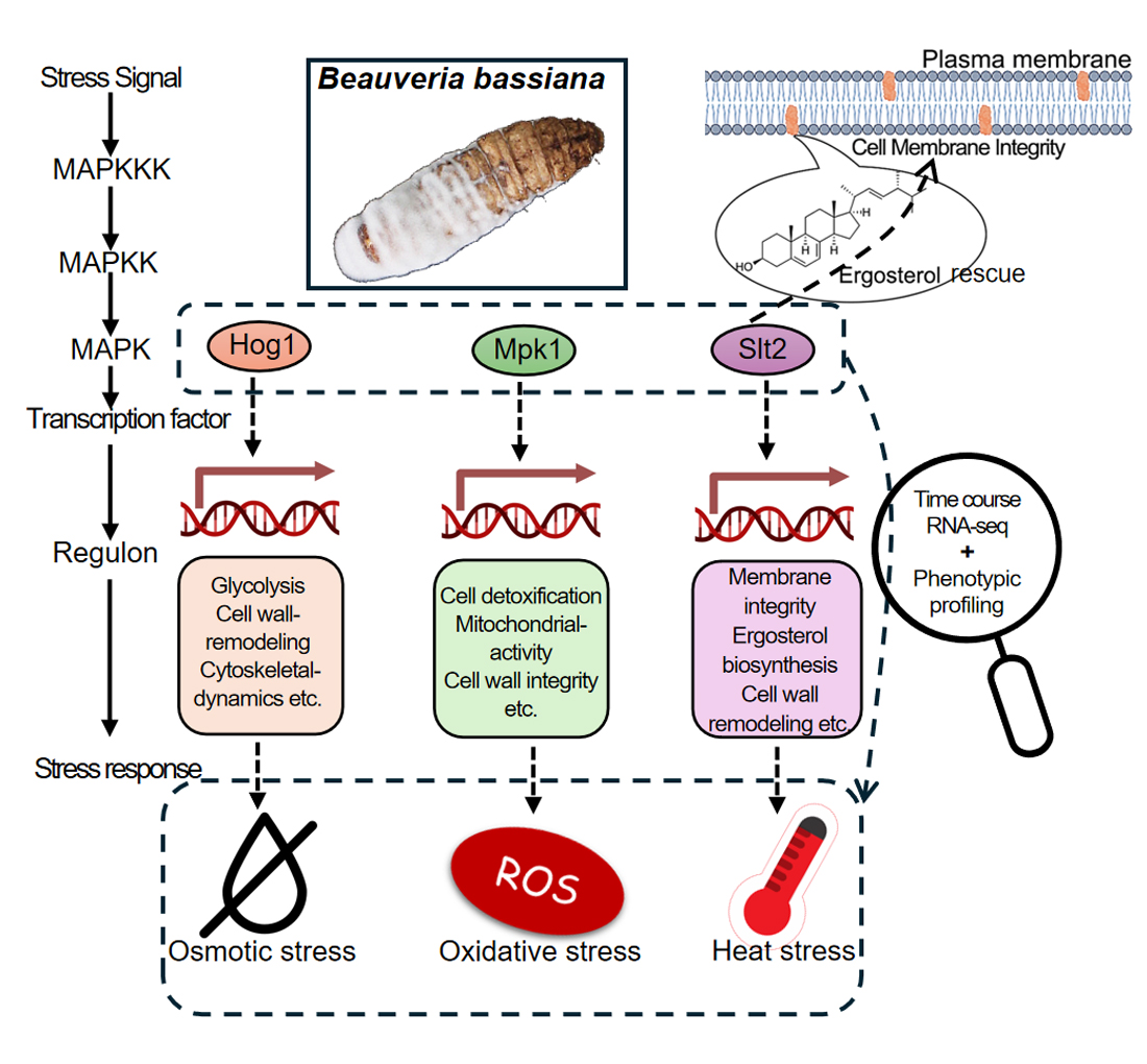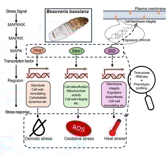 10]. Mitogen-activated protein kinase (MAPK) cascades are essential for enabling entomopathogenic fungi to infect host insects and endure adverse environmental conditions by maneuvering cellular responses against osmotic, oxidative, cell-wall, and thermal stress conditions [