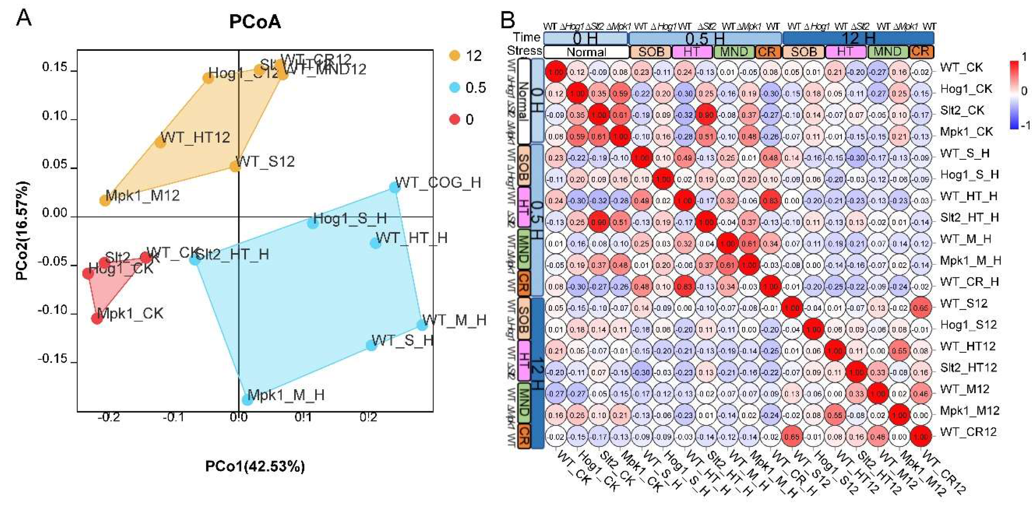For transcriptomic data similarity analysis, transcript reads from all 18 samples were collected and subjected to R package “ape” (v 5.6) for generation of a PCoA plot, and the hierarchical clustering visualization tool in the Omicshare platform was used for RNA-seq sample data clustering. DEG overlap datasets comparing stress conditions were analyzed by collecting DEG groups under 6 stress conditions and subjected to the nVenn tool for generation of a Venn plot [