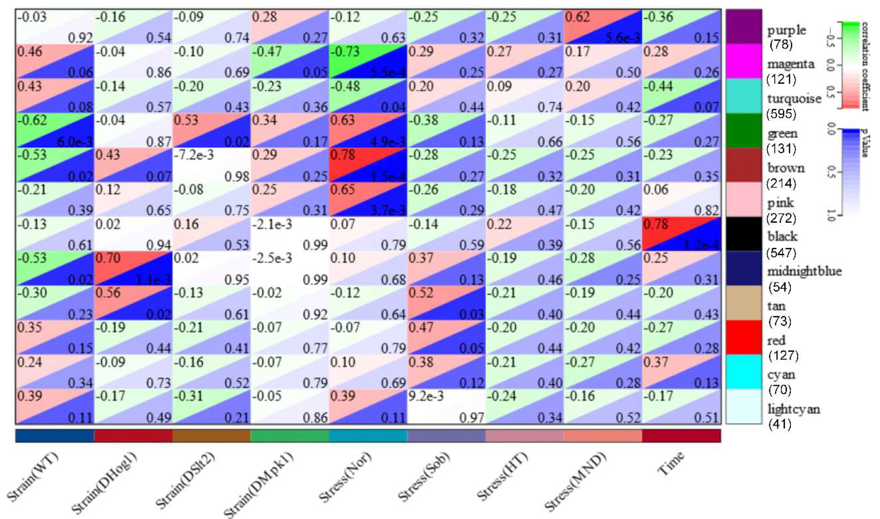 21]—and a hierarchical clustering method (Pearson) were employed for gene co-expression analysis. Briefly, extracted transcript counts from all constructed transcriptomes were subjected to Coseq in R for normalization, with Log-Centered Log Ratio (LogCLR) transformation as an expression index indicating transcript abundance in RNA-seq samples. A co-expression compendium was constructed with the k-means clustering algorithm after TMM normalization of LogCLR-transformed reads. Co-expressed genes across the 18 sets of transcriptomic data were clustered and formed 80 modules. For generation of the co-expression networks, the WGCNA protocol was employed. In brief, FPKM values of all 18 transcriptomes were subjected to the online WGCNA package in R. After sample-type classification, hierarchical clustering was conducted to classify genes with similar expression profiles that generated 12 modules after optimization of the correlation threshold of gene–gene co-expression. All of the 12 modules with co-expression degree and gene information were exported and subjected to Cytoscape (v 35.0) and Gephi (v 0.10.1) for generation of co-expression networks with deliberate decorative editing of modular gene functions.