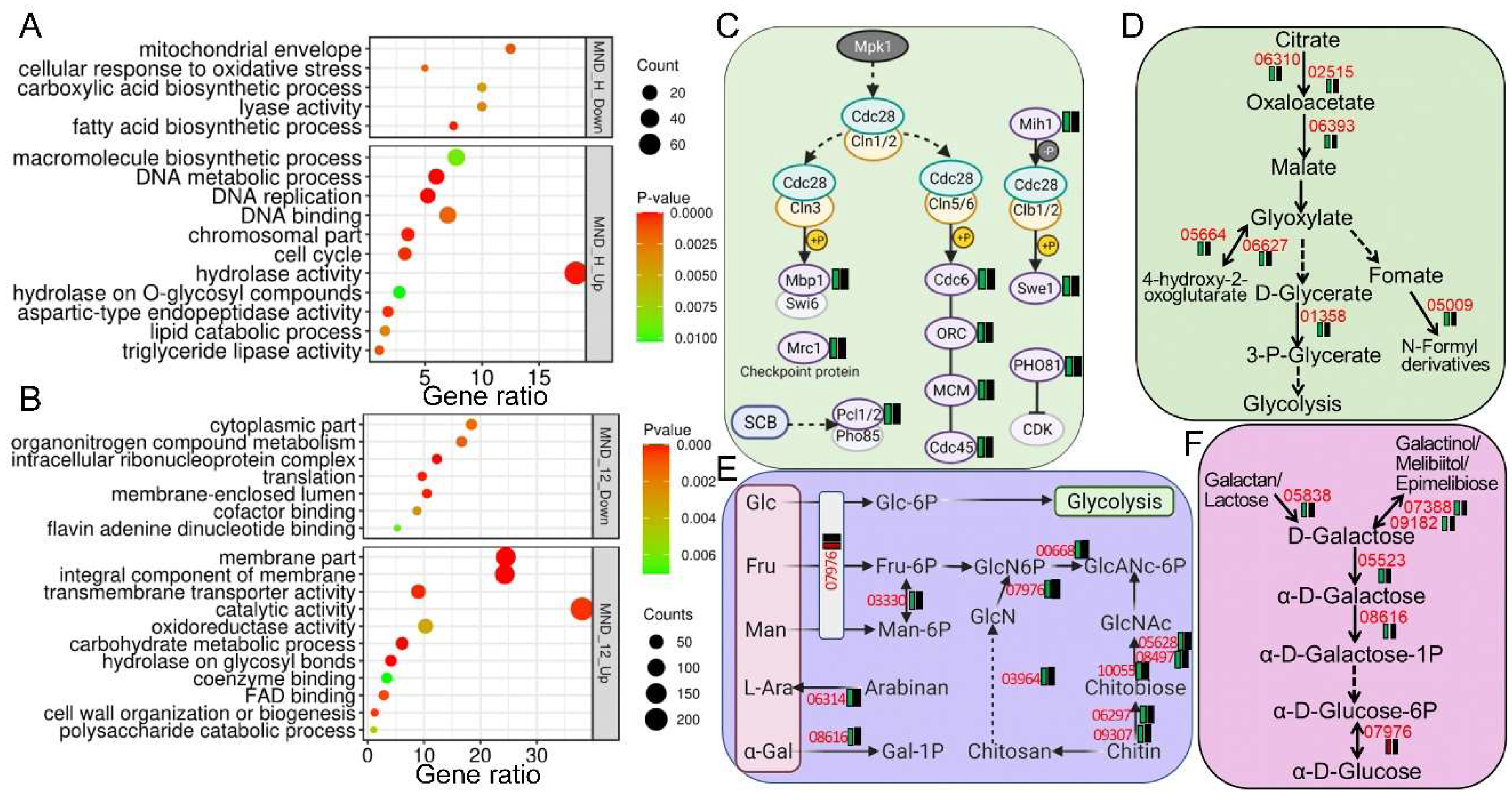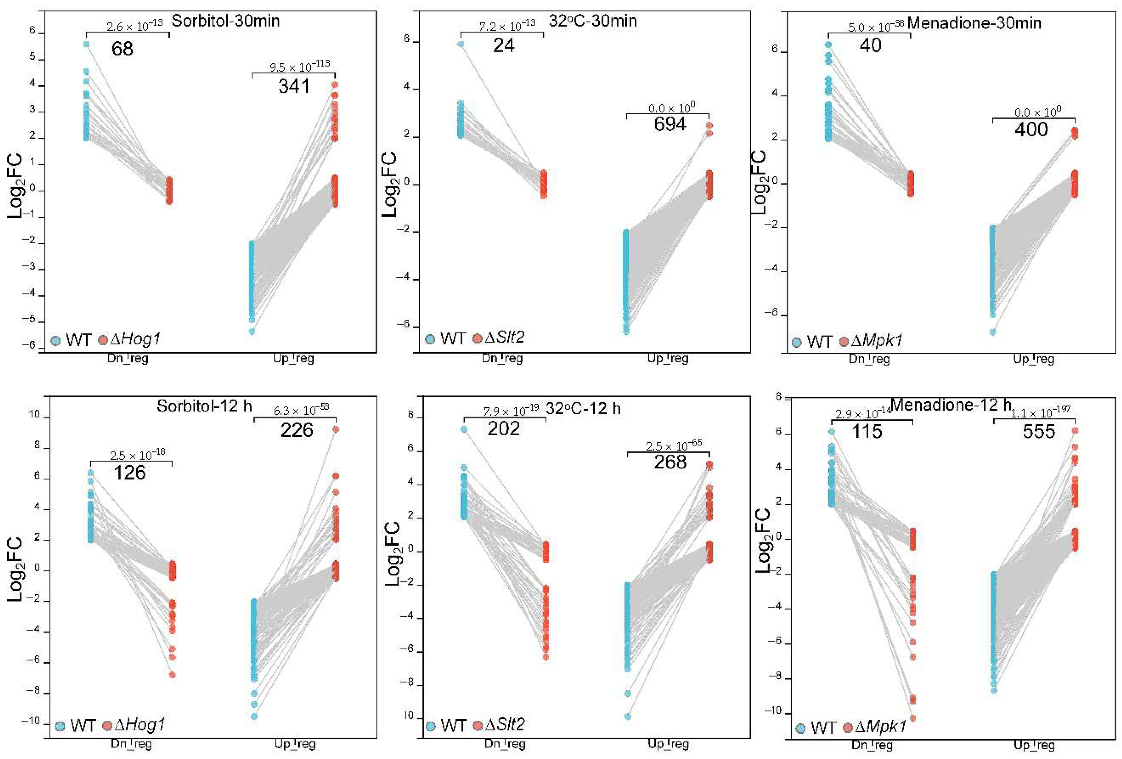 Transcript counts were first filtered by removing genes with 0 counts in the data for the wild-type and mutant strains, then transformed into FPKM (Fragments Per Kilobase of transcript per Million mapped reads) values with R package DESeq2 (v 1.36.0). A value of 1 was added to all FPKM values (FPKM + 1); then, the values were transformed with a log2-based algorithm and quantile normalization to correct data bias and generated DEGs in stress (st) as compared to the normal condition with the following formula: Log2((FPKMst + 1)/(FPKMnor + 1)). A filtration of the expression ratio was performed such that genes with |Log2FC| ≥ 2 were screened as DEGs and those with|Log2FC| ≤ 0.5 were categorized as silent genes. The differential expression genes in MAP-kinase mutants responding to abiotic stress were evaluated according to a curated algorithm to identify upregulated DEGs in MAPK mutants responding to the given stress, i.e., DEGsUp = Log2FC(WTst/WTnor) ≤ −2& Log2FC(ΔMAPKst/ΔMAPKnor) ≥ −0.5), and downregulated DEGs, i.e., DEGsDn = Log2FC(WTst/WTnor) ≥ 2& Log2FC (ΔMAPKst/ΔMAPKnor) ≤ 0.5.