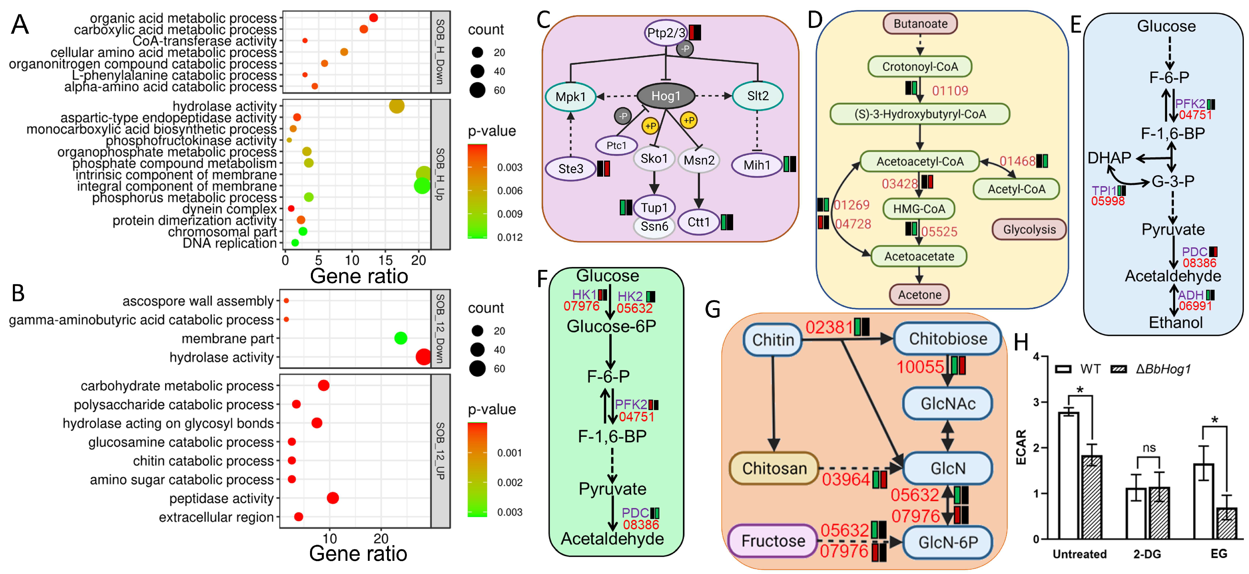 Bbhog1 mutant exhibits markedly reduced levels of erythritol and arabinitol under osmotic stress, which are crucial for maintaining cellular osmotic balance (14). Our data also indicated that the ablation of BbHog1 downregulated three key genes in glycolysis, and the glycolysis stress assay showed decreased glycolysis activity of Δ