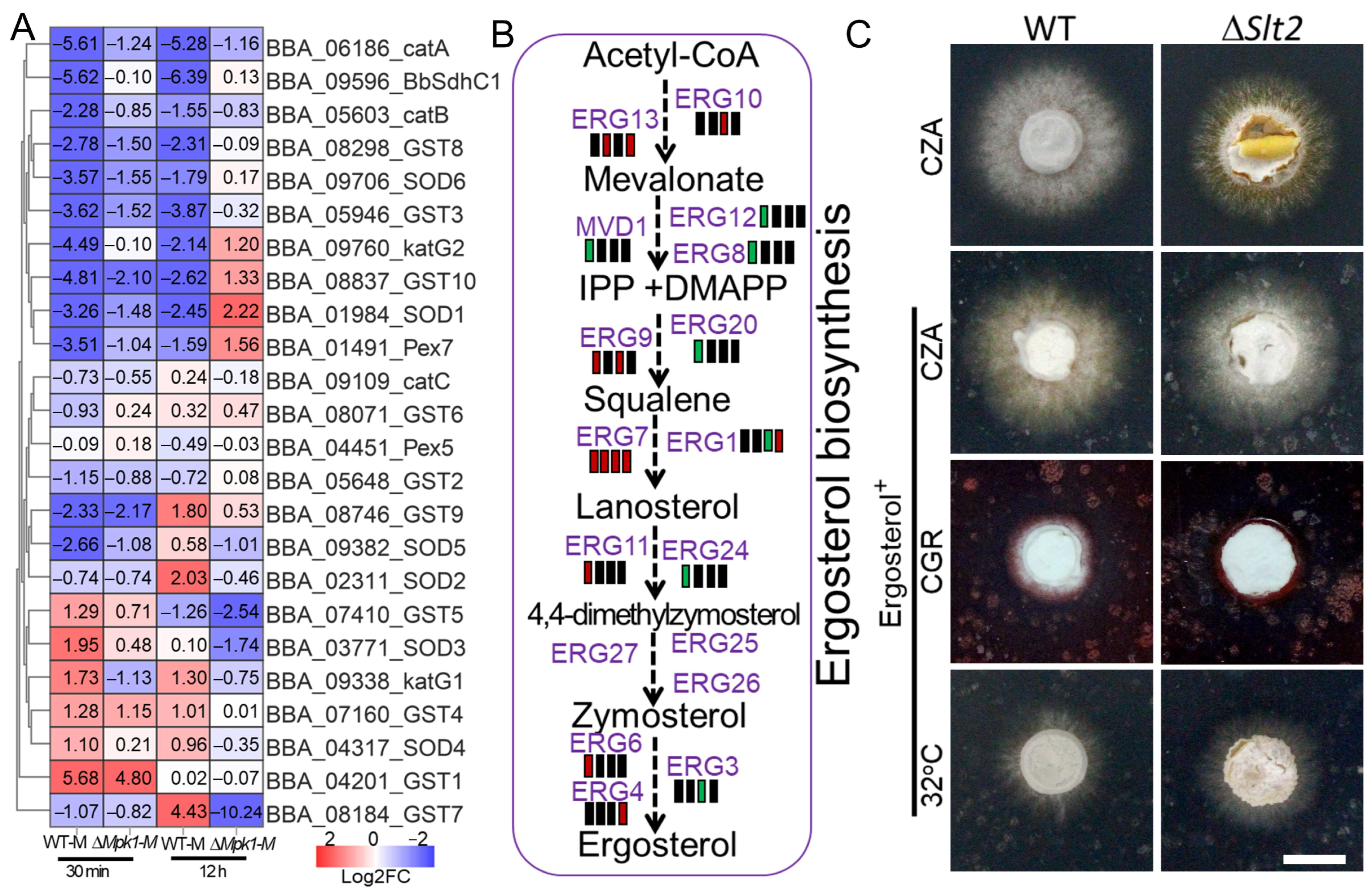BbSlt2 growth under heat and cell-wall stress, indicating that Slt2 positively regulates membrane sterol balance, a phenomenon also observed in lipid-deficient strains of