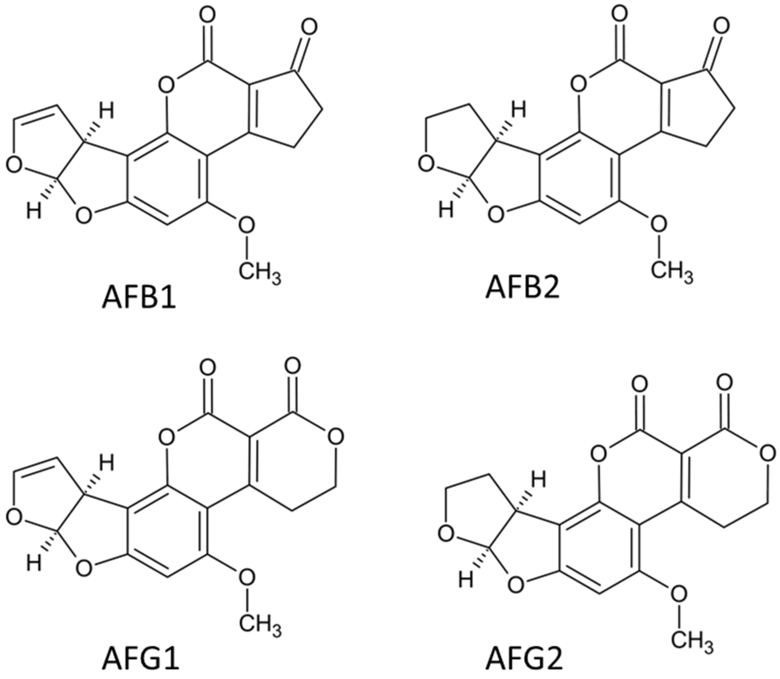 Aflatoxins (AFs) are a group of mycotoxins primarily produced by Aspergillus species. Aflatoxins are the most significant mycotoxins in terms of their occurrence, human impact, toxicity, and abundance. Aspergillus species such as A. flavus, A. bombycis, A. seudotamarii, A. nomius, and A. parasiticus, can infest several crops, foods, and agricultural products, leading to the production of aflatoxins, which are classified as AFB1, AFB2, AFG1, AFG2, AFM1, and AFM2. The commonly known naturally occurring AF types, AFB1, AFB2, AFG1 and AFG2, are primarily produced by A. flavus, A. parasiticus, and A. nomius [35,36,37,38]. Aflatoxins commonly contaminate staple crops, including maize (corn), groundnuts (peanuts), tree nuts (pistachios, almonds, and walnuts), cottonseed, spices, dried fruits and rice, where the opportunistic pathogen, A. flavus, commonly thrives [22,39].