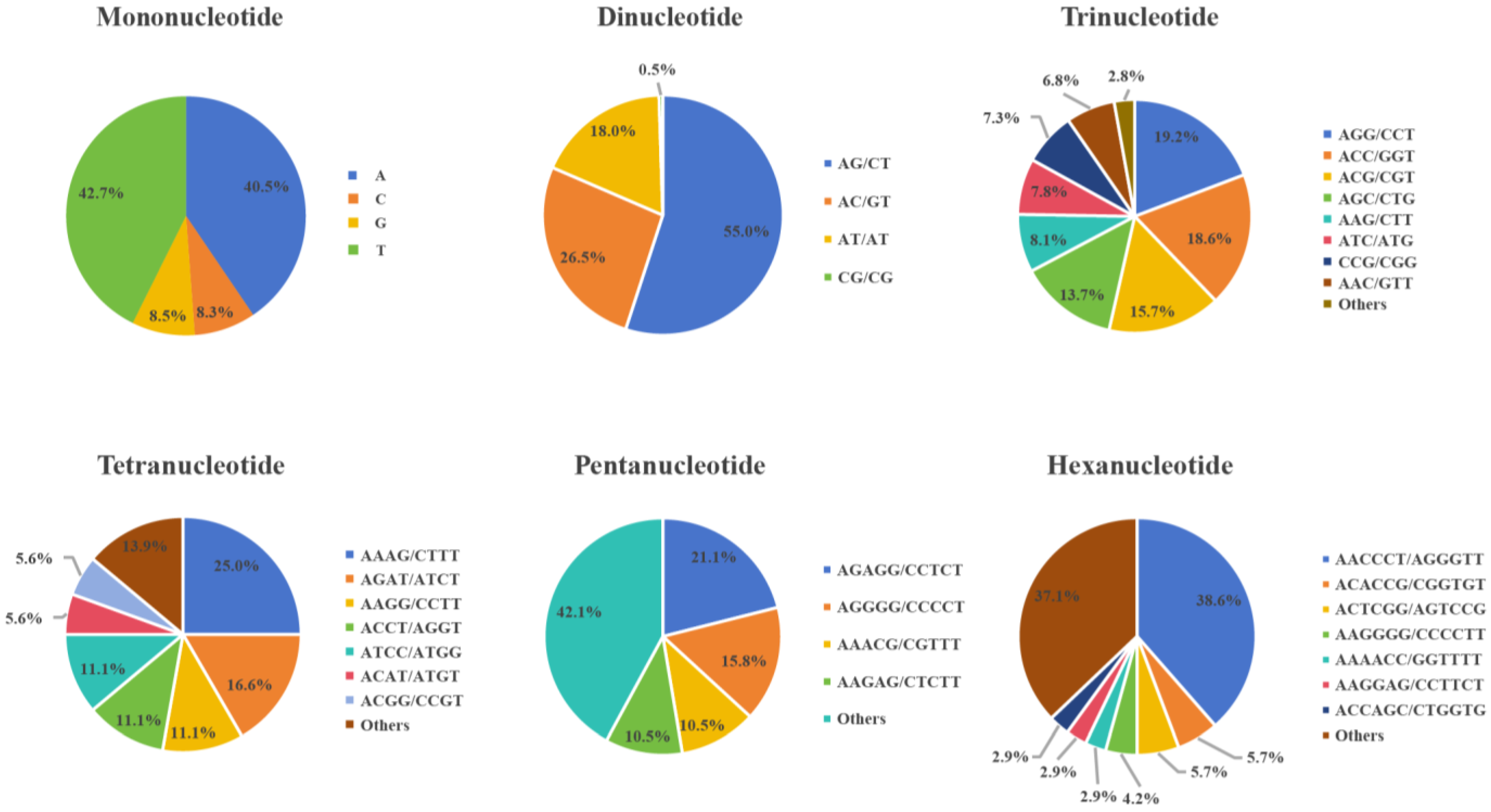 Figure 1. Proportions of different types of simple sequence repeat (SSR) units in the H. marmoreus genome. Each pie chart represents the SSR loci with different repeat units in the genome.