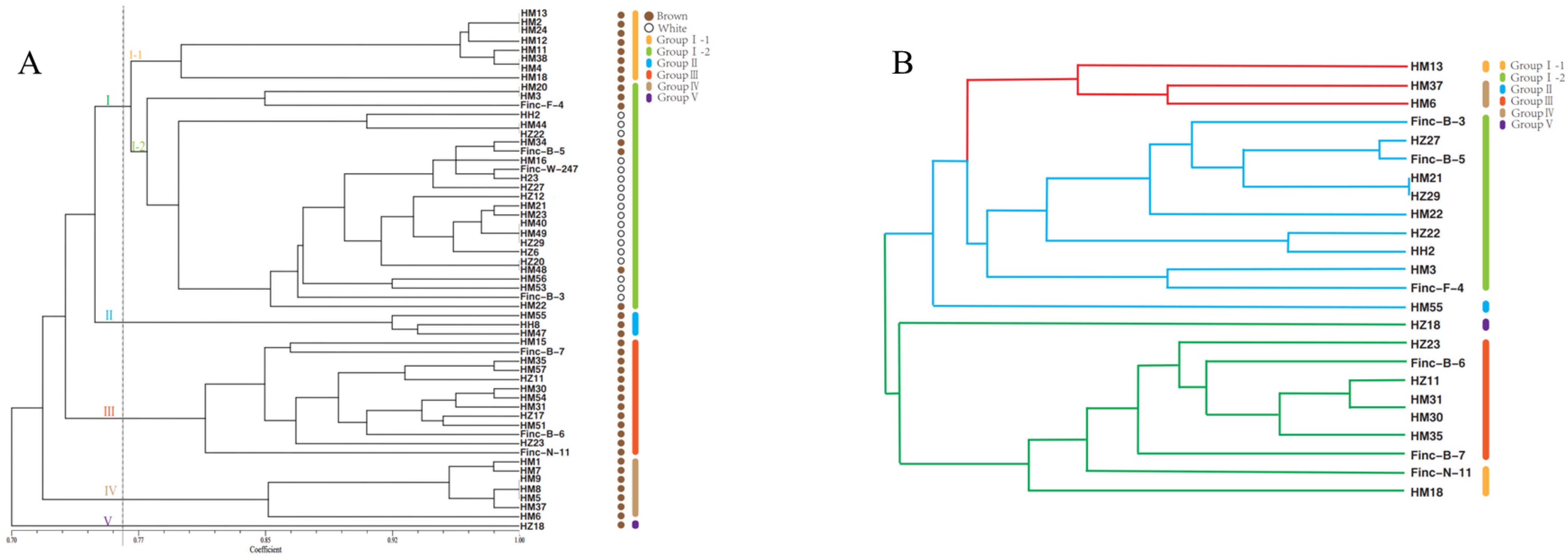 Figure 3. Phylogenetic analysis of 57 original germplasms (A) and 24 core collections (B) H. marmoreus based on UPGMA.