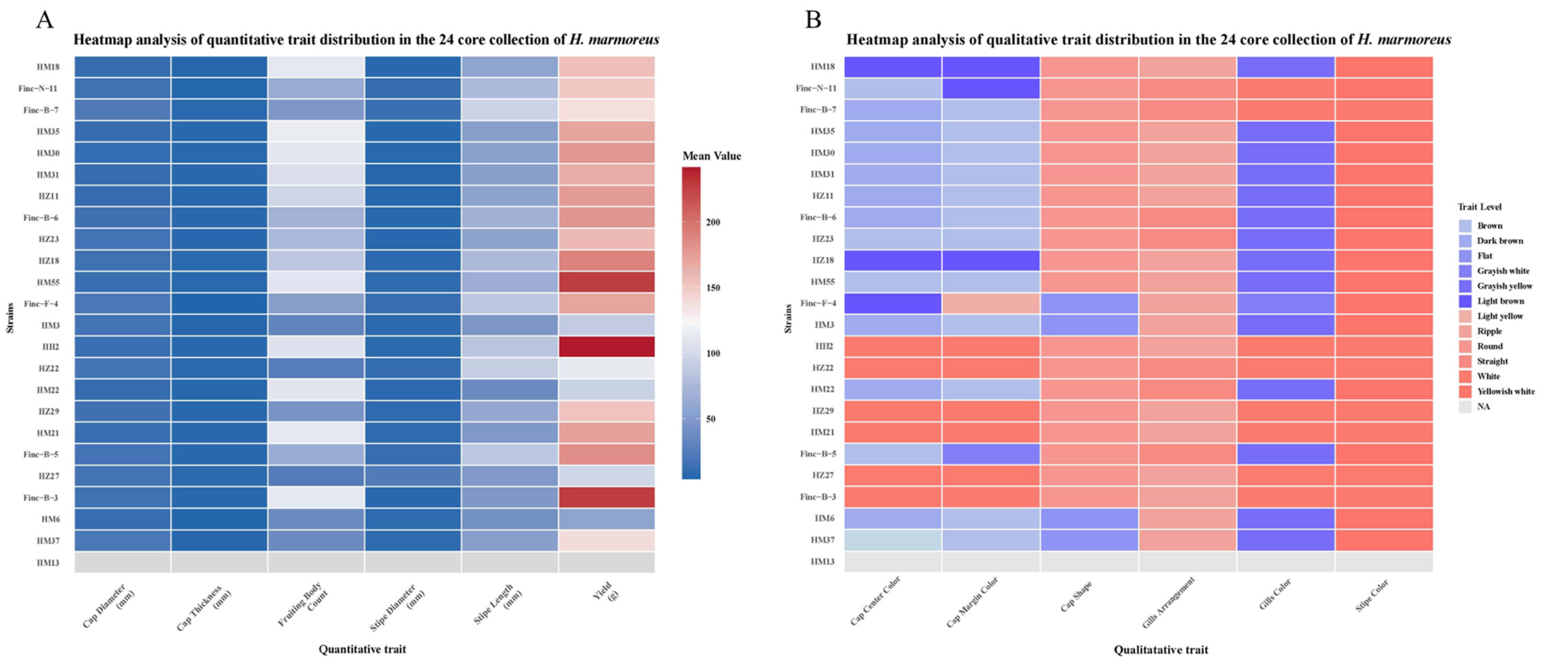 Figure 5. Heatmap of 24 core collections based on main quantitative traits (A) and qualitative traits (B) of H. marmoreus.