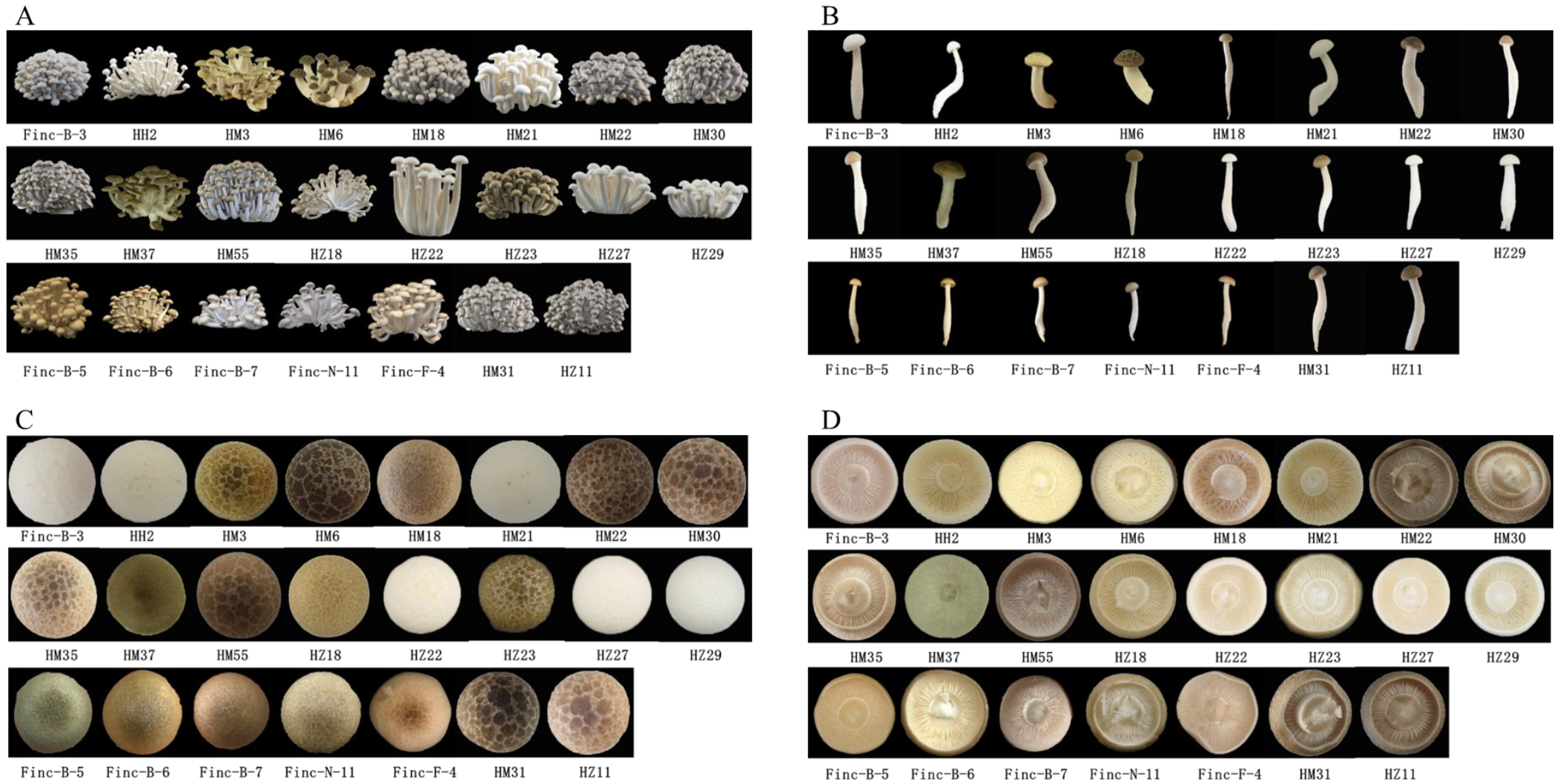 Figure 6. Agronomic traits of 24 core collections of H. marmoreus ((A), entire fruiting body; (B), single fruiting body; (C), the front of cap; (D), the back of cap).