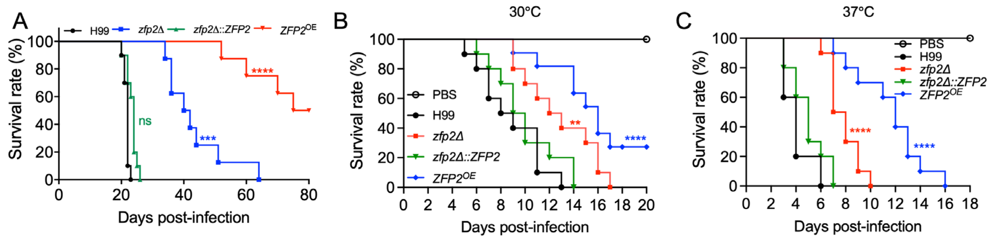 3.5. Zfp2 Plays an Important Role in Fungal Virulence in Mouse and Wax Moth Infection Models