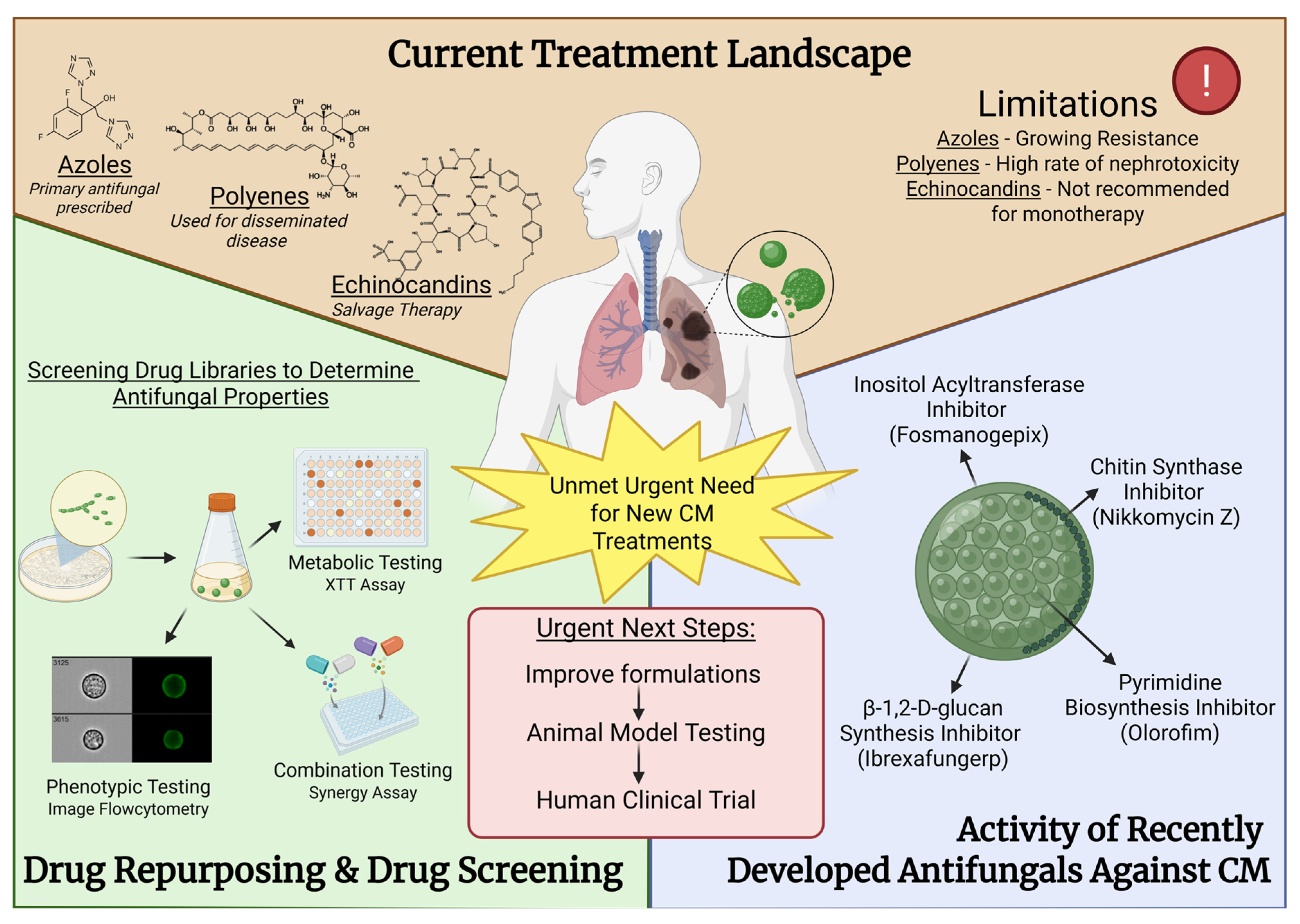 - Saeger, S.; West-Jeppson, K.; Liao, Y.-R.; Campuzano, A.; Yu, J.-J.; Lopez-Ribot, J.; Hung, C.-Y. Discovery of novel antifungal drugs via screening repurposing libraries against Coccidioides posadasii spherule initials. mBio 2025, 16, e0020525. [Google Scholar] [CrossRef]