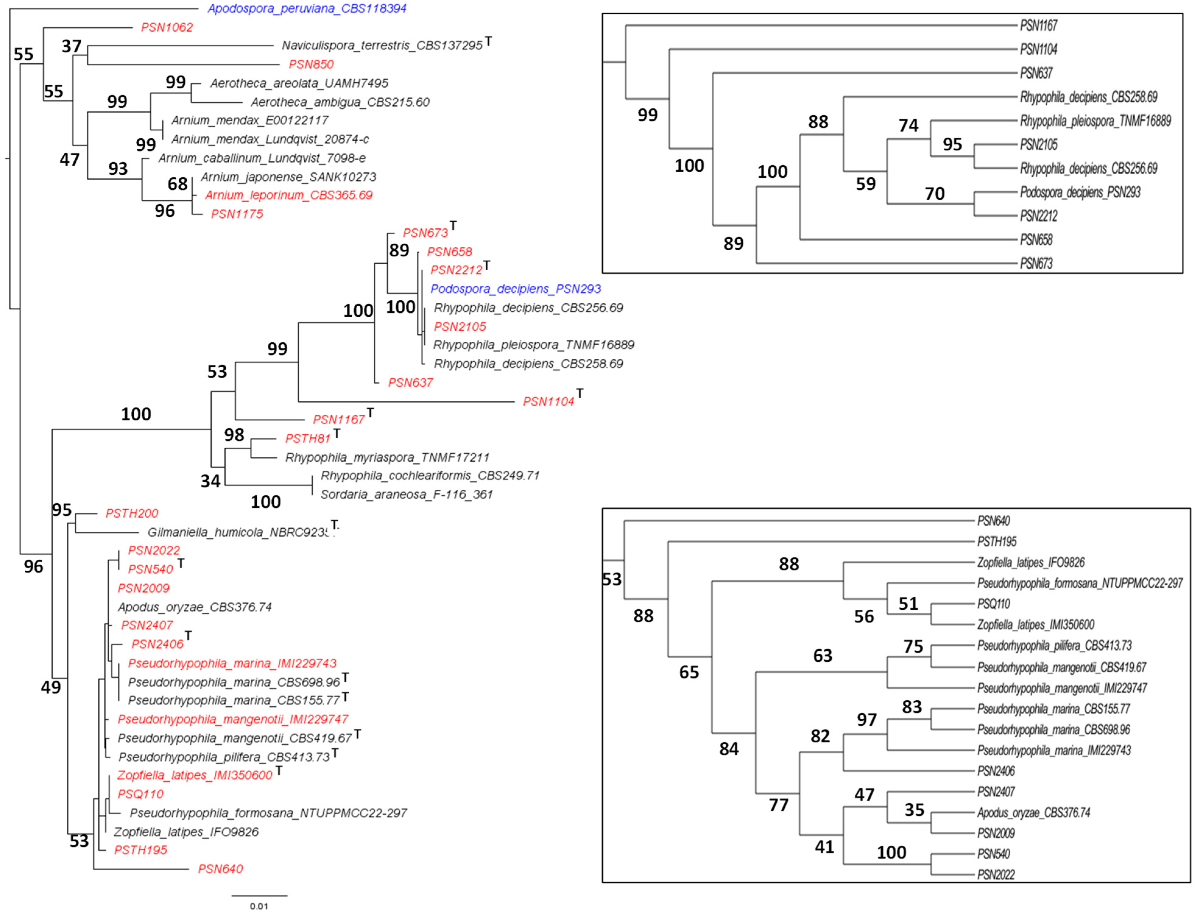 - Eight newly isolated strains awaiting further characterization, some of which may belong to species new to science: P. aff. araneosa PSN1062, Naviculispora sp. PSN850, A. aff. japonense PSN1175, Rhypophila sp. PSN637, Gilmaniella sp. PSTH200, Pseudorhypophila sp. PSN640, Pseudorhypophila sp. PSN2407 and Pseudorhypophila sp. PSTH195;