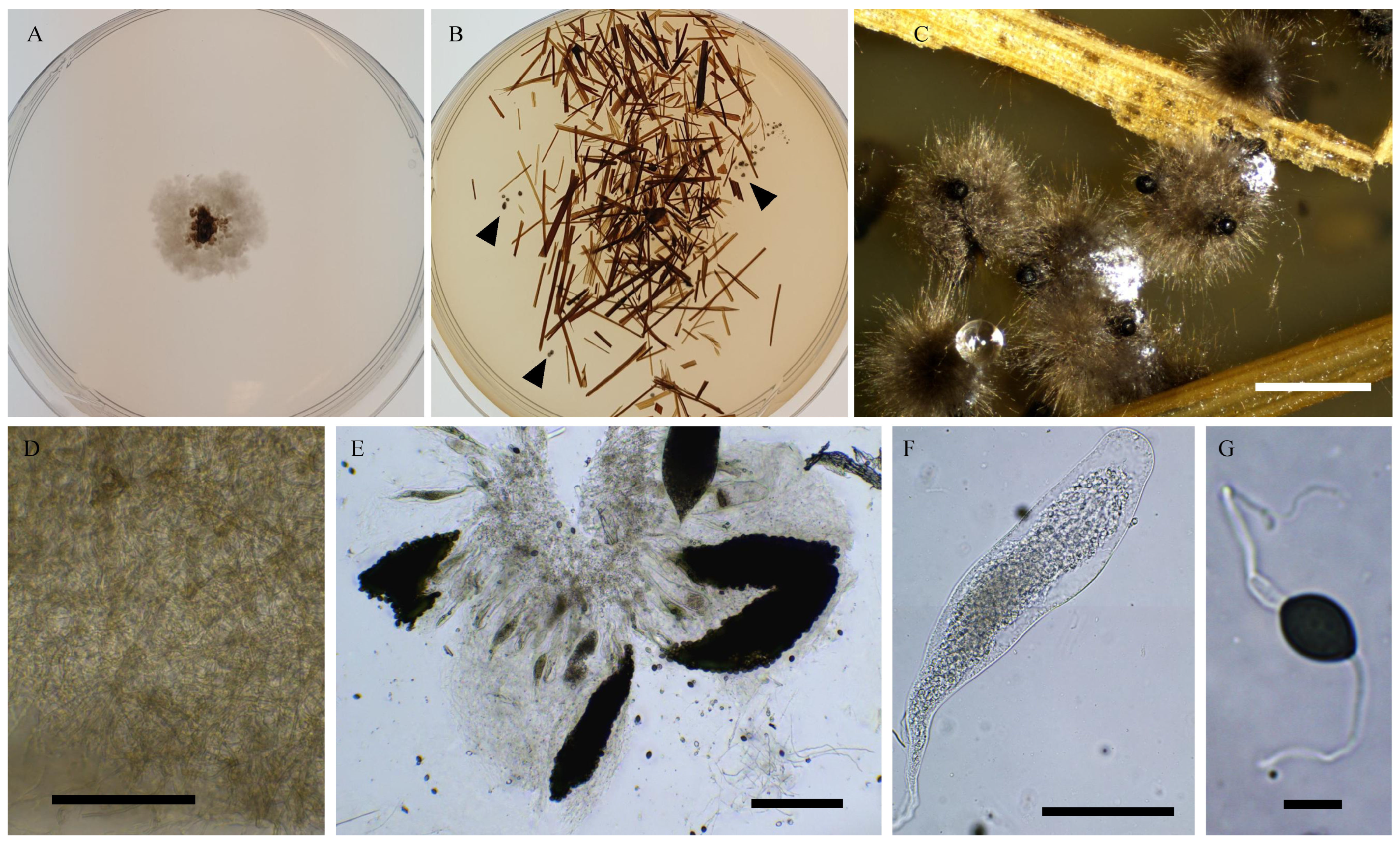 - Mirza, J.H.; Cain, R.F. Revision of the genus Podospora. Can. J. Bot. 1969, 47, 1999–2048. [Google Scholar] [CrossRef]