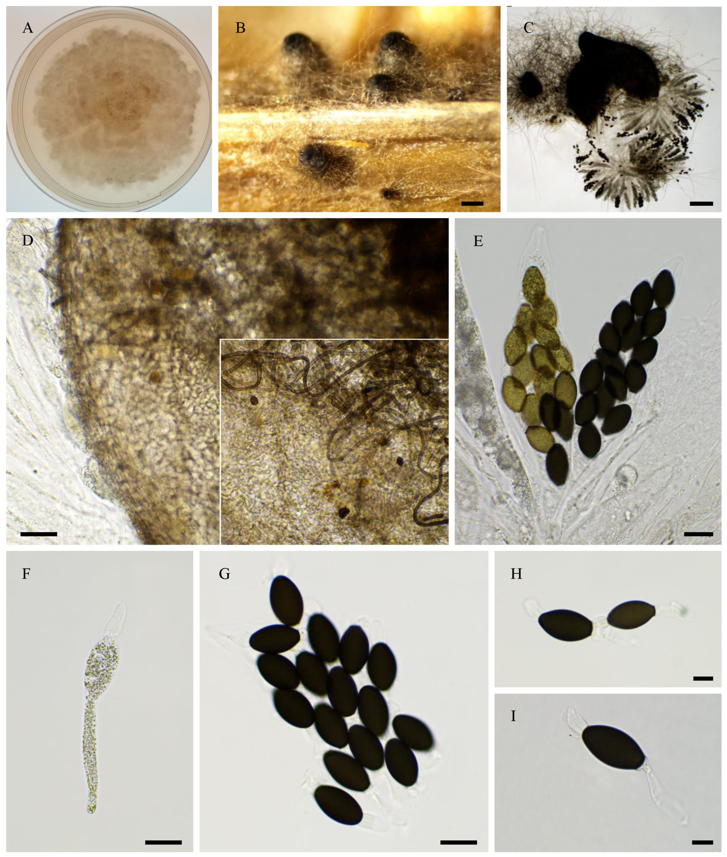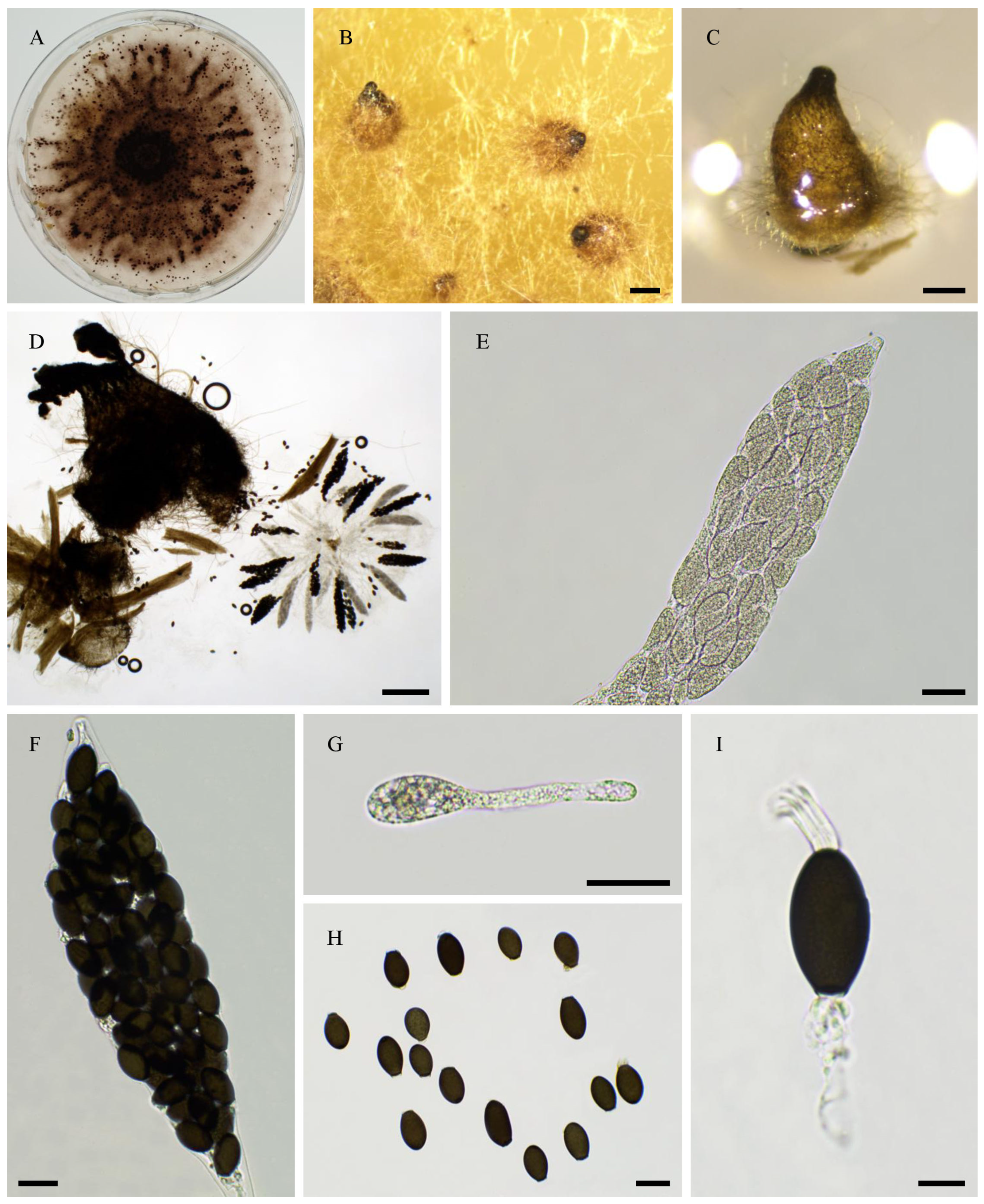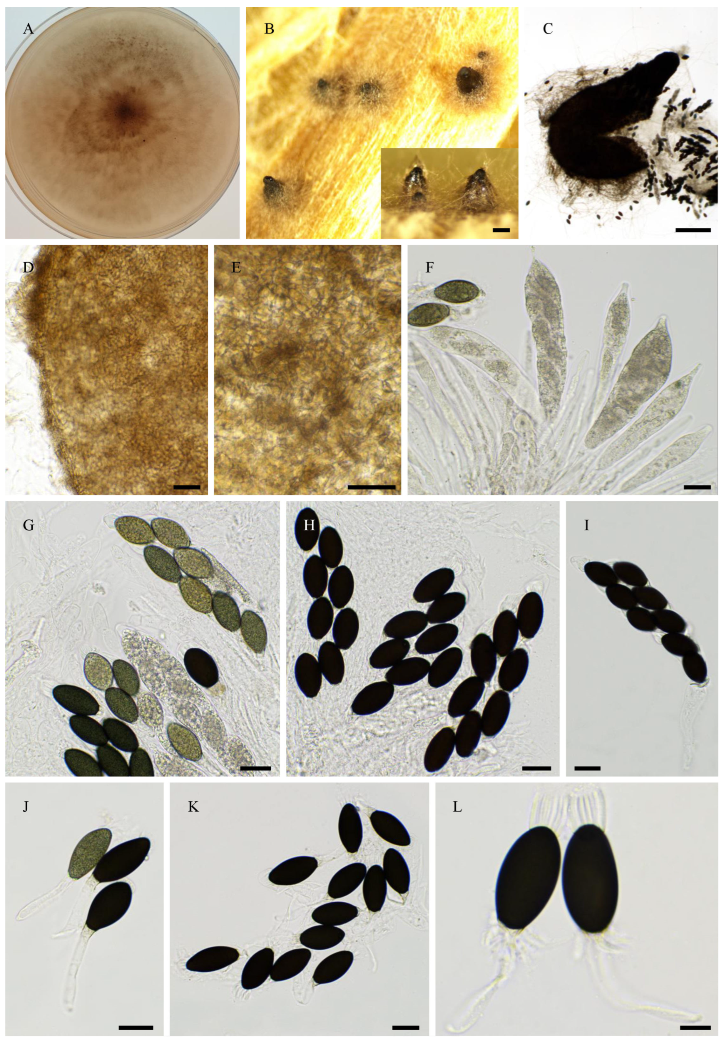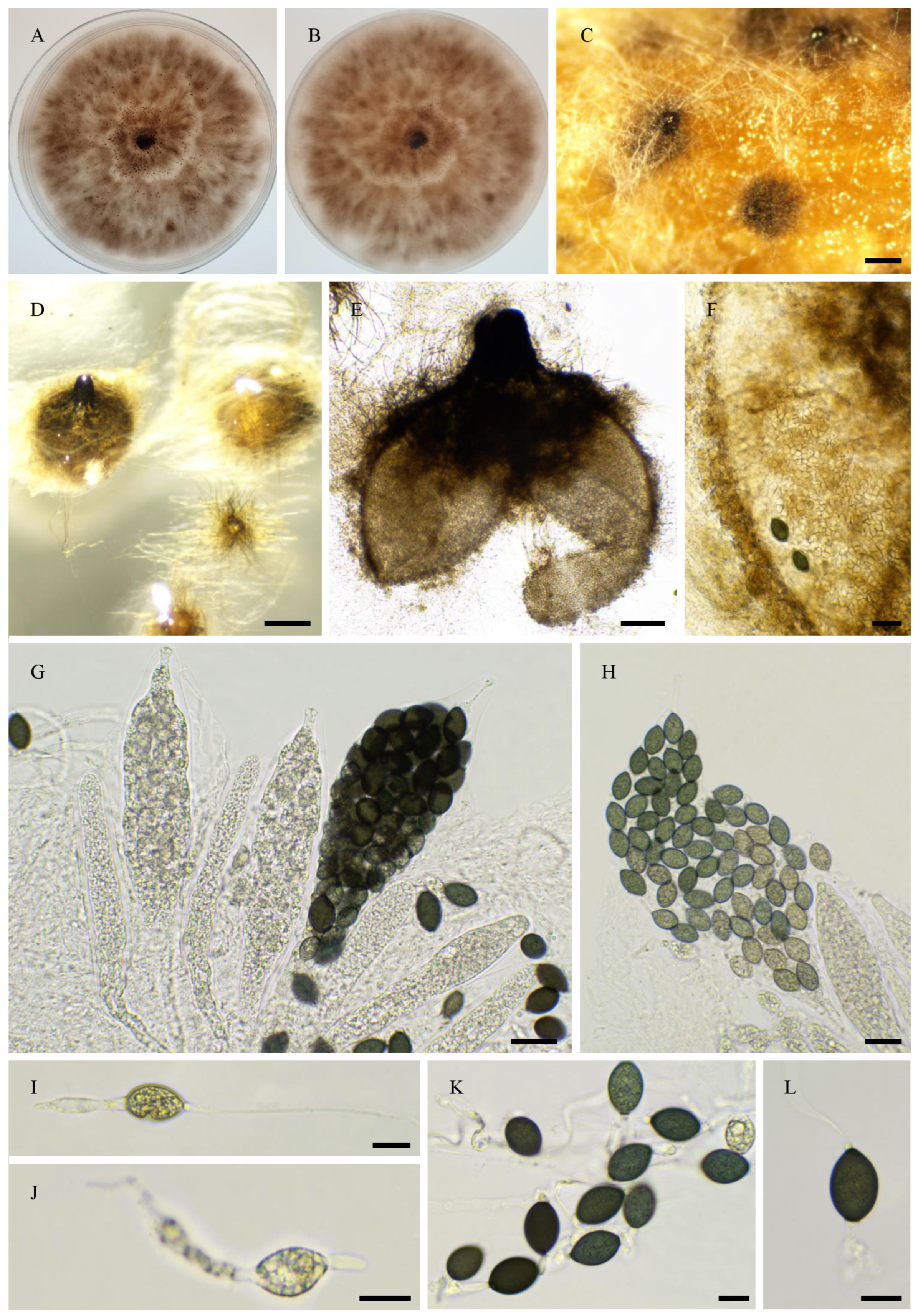 - Cai, L.; Jeewon, R.; Hyde, K.D. Molecular systematics of Zopfiella and allied genera: Evidence from multi-gene sequence analyses. Mycol. Res. 2006, 110, 359–368. [Google Scholar] [CrossRef]