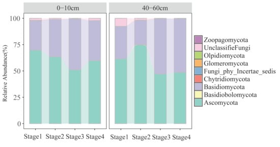 The relative abundance of dominant fungal phyla varied significantly with both soil depth and forest successional stage (Figure 1). Ascomycota and Basidiomycota were consistently the two most dominant phyla across all stages and depths. In particular, the topsoil supported a significantly higher relative abundance of Ascomycota compared to the subsoil, while Basidiomycota showed higher abundance in later successional stages. Notable shifts in phyla such as Chytridiomycota and Glomeromycota were also observed along the successional gradient, suggesting differential responses of fungal taxa to vegetation development. Subsoil communities exhibited lower overall abundance but higher compositional variability across stages, particularly in early successional phases (Figure 1).