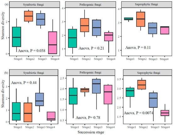 Soil fungal Shannon diversity exhibited distinct patterns across successional stages and soil depths, with varying responses among trophic modes (Figure 3). In the topsoil, symbiotic fungi showed a significant shift in diversity across succession (ANOVA, p = 0.038), while saprophytic and pathogenic fungi did not exhibit significant differences (p > 0.05). In contrast, within the subsoil, saprophytic fungi diversity changed significantly over successional stages (ANOVA, p = 0.0074), whereas symbiotic and pathogenic fungi diversity remained relatively stable (p > 0.05). These results suggested that soil depth modulates the successional trajectory of fungal diversity in a trophic-specific manner (Figure 3).