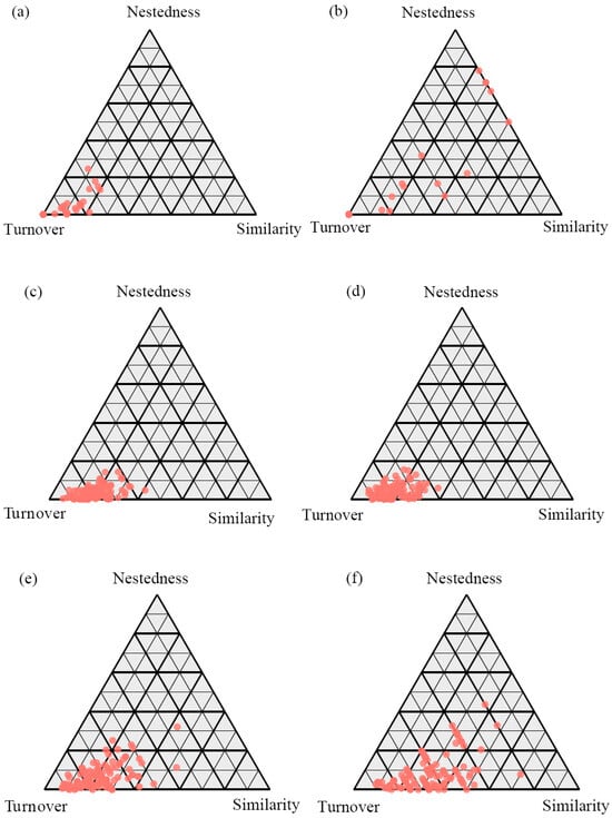 - Baselga, A.; Orme, C.D.L. Betapart: An R Package for the Study of Beta Diversity. Methods Ecol. Evol. 2012, 3, 808–812. [Google Scholar] [CrossRef]