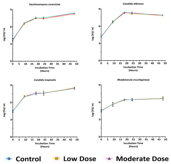 Growth curves of four representative yeast strains in YPD medium under control, low, and moderate antibiotic doses, showing no significant differences in growth patterns at all time points compared to control (p > 0.05).