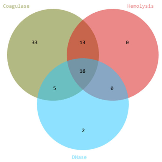 Safety screening and virulence capability of yeast isolates. Venn diagram showing the distribution of isolates positive for hemolytic, DNase, and coagulase activities.