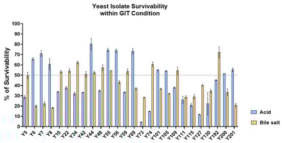 Acid and bile salt tolerance of yeast isolates. Survivability (%) of 26 yeast isolates was evaluated after exposure to acidic conditions (pH 2.0) and 0.5% bile salts. Data represent mean ± SD from triplicate experiments. The dotted line indicates 50% survival, used as the threshold for moderate tolerance.
