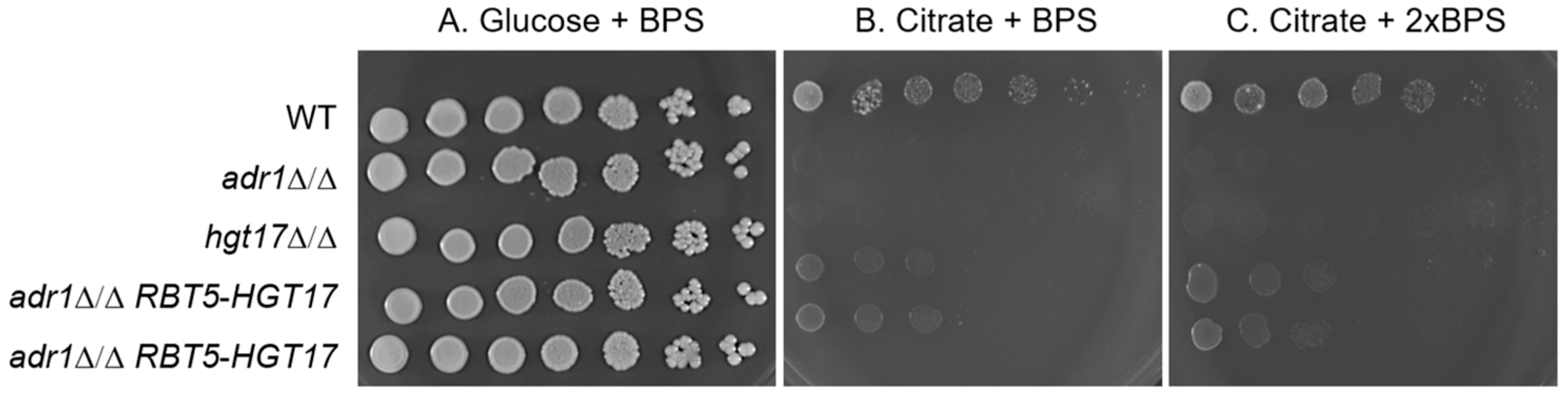 3.1. Impact of HGT17 on the adr1Δ/Δ Mutant Growth Phenotype