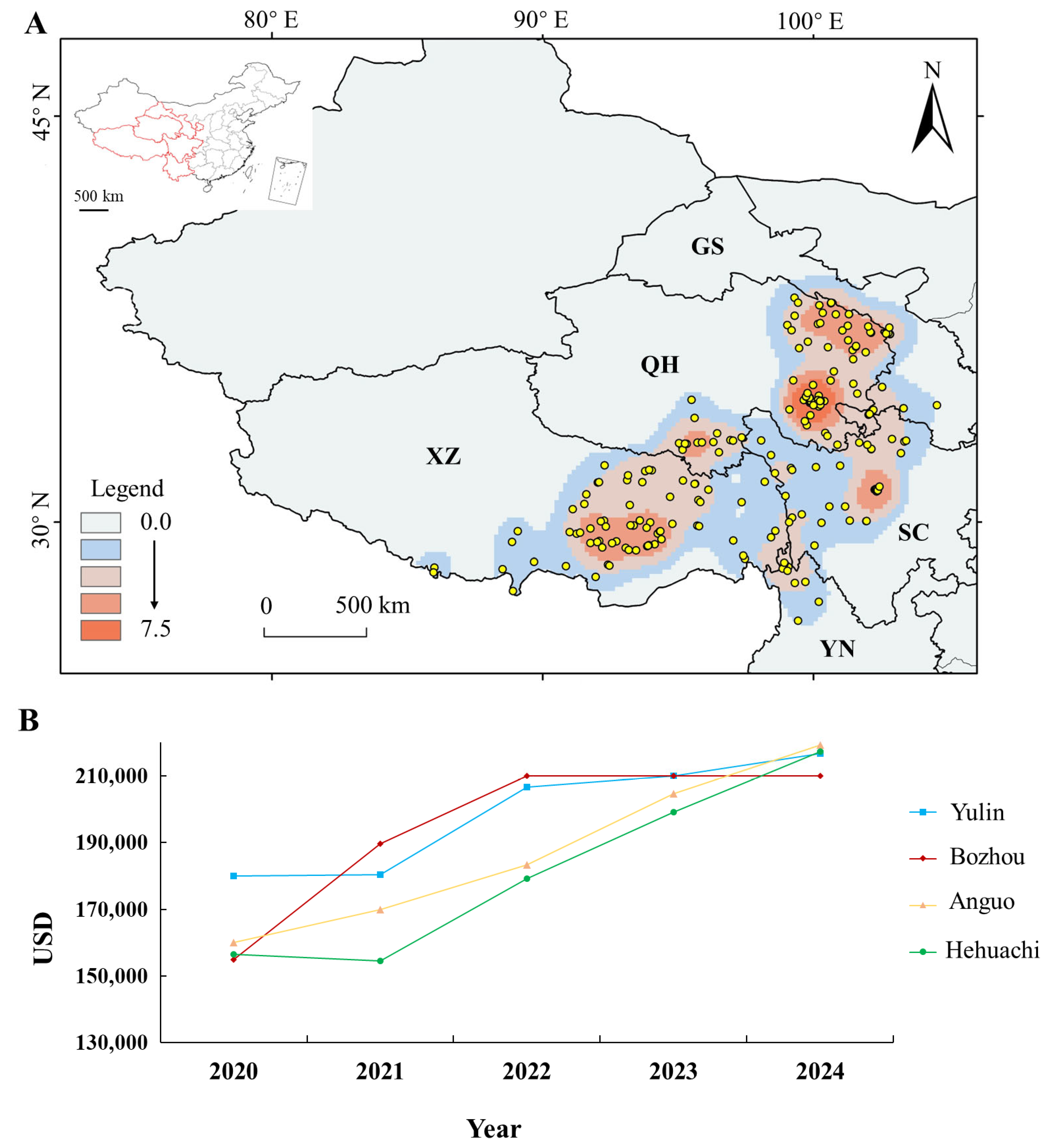 - Bennike, R.B.; Nielsen, M.R.; Smith-Hall, C. Do high-value environmental products provide a pathway out of poverty? The case of the world’s most valuable fungus (Ophiocordyceps sinensis). Environ. Dev. 2025, 56, 101281. [Google Scholar] [CrossRef]