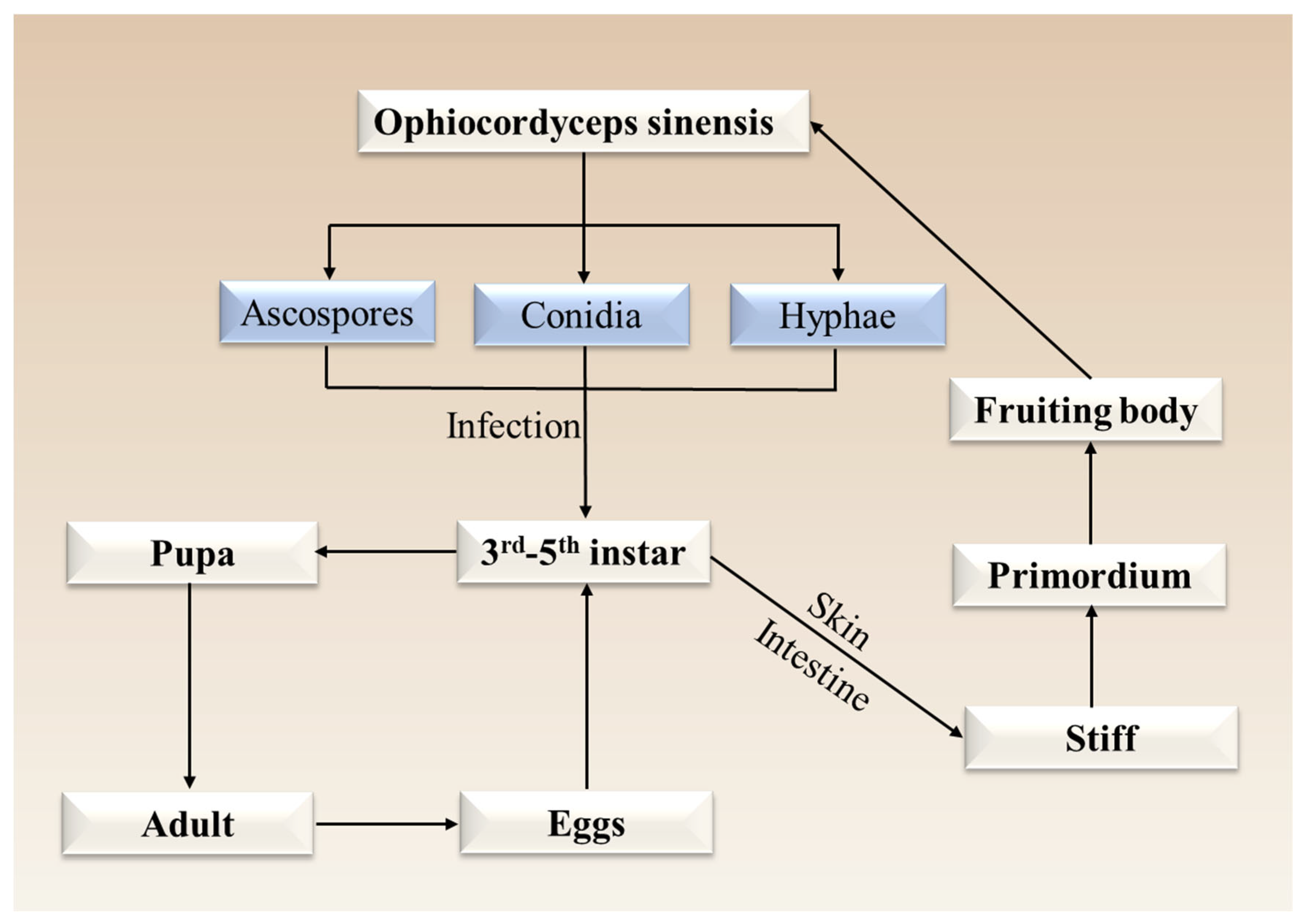 - Liu, G.Q.; Han, R.C.; Cao, L. Artificial cultivation of the Chinese Cordyceps from injected ghost moth larvae. Environ. Entomol 2019, 48, 1088–1094. [Google Scholar] [CrossRef] [PubMed]
