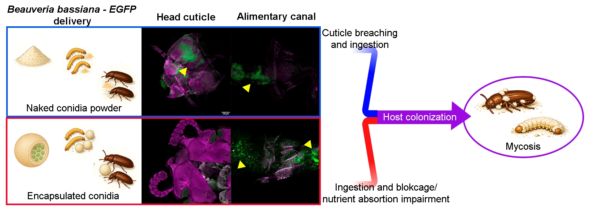 Preisegger, L.; Flecha, J.C.; Ghilini, F.; Espin-Sánchez, D.; Prieto, E.; Oberti, H.; Abreo, E.; Huarte-Bonnet, C.; Pedrini, N.; Mannino, M.C. Visualizing Oral Infection Dynamics of Beauveria bassiana in the Gut of Tribolium castaneum. J. Fungi 2025, 11, 101. https://doi.org/10.3390/jof11020101
