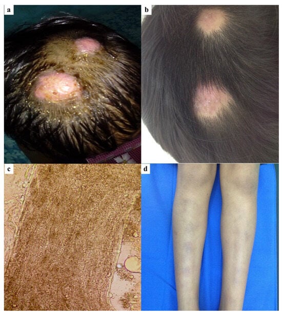 An 8-year-old girl: (a) Inflammatory tinea capitis on the left occipital and parietal scalp regions; (b) At 6-week follow-up after treatment with itraconazole and prednisone, all scalp lesions resolved, leaving focal scarring alopecia; (c) Ecto-endothrix parasitization in the hair shaft; (d) Erythema nodosum on both shins developed one week after antifungal treatment.