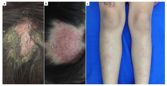- Topaloğlu Demir, F.; Karadag, A.S. Are Dermatophytid Reactions in Patients with Kerion Celsi Much More Common Than Previously Thought? A Prospective Study. Pediatr. Dermatol. 2015, 32, 635–640. [Google Scholar] [CrossRef] [PubMed]