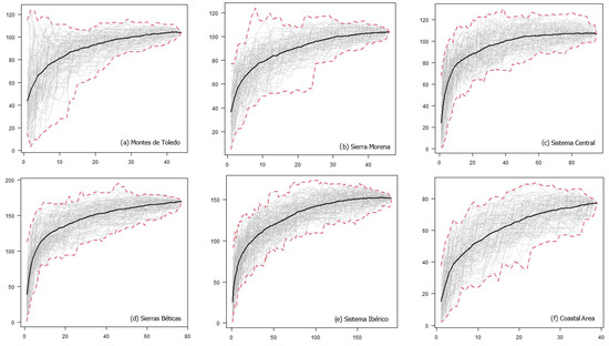 For each geographic area, we also generated UTM-based “host preference” accumulation curves [33], which illustrated the increase in the number of lichen species growing on a single host species as sampling effort increased in each area (i.e., as more 10 × 10 km UTM cells are considered). At the onset of sampling, numerous exclusive species were obtained since the epiphytic species growing on very few host species were compared, thereby increasing the slope of the curve. We anticipated that as more UTM cells were incorporated, the curve would stabilize at an asymptote. Therefore, we utilized exclusivity at the UTM level by randomly adding the UTMs and plotting the curves as the average host preference in 99 random subsets for each number of UTM cells. Accumulation curves were generated for each geographic area (local level) and for the entire region (regional level using the total dataset). Using these curves, we could assess the variation of lichen preference in each geographic area (i.e., how variable the exclusivity is as the number of UTMs increases). Calculations were performed using the vegan package [34] in R [35].