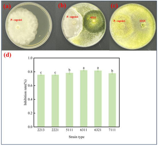 Figure 1. Biocontrol microorganisms and P. capsici dual-culture test and developmental tree of strains after 7 days of inoculation. (a) Inoculation with P. capsici only; (b) inoculation with Trichoderma 6311 and P. capsici; (c) inoculation with Trichoderma 2213 and P. capsici; (d) inhibition of P. capsici by the biocontrol microorganisms. Identical letters denote no significant differences between the respective groups (p > 0.05), whereas differing letters indicate a significant difference (p < 0.05).