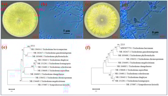 Figure 2. Morphological and molecular identification of biocontrol microorganisms. (a,b) Trichoderma 2213 colony morphology and spore morphology; (c,d) Trichoderma 6311 colony morphology and spore morphology; (e,f) 2213 and 6311 developmental trees.