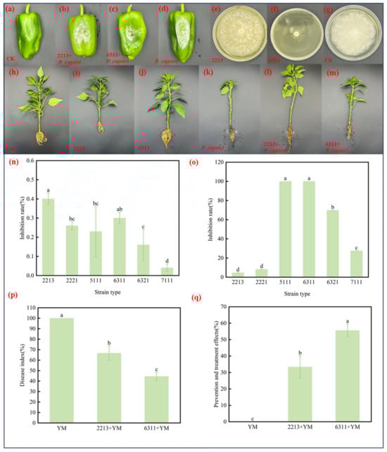 Figure 3. Results of pepper fruit or plant potting experiment. (a) CK group without any added microorganisms; (b) 2213+ P. capsici treatment group; (c) 6311+ P. capsici treatment group; (d) P. capsici treatment group; (e) no fermentation solution inhibition of P. capsici; (f) 2213 fermentation solution inhibition of P. capsici; (g) 6311 fermentation solution inhibition of P. capsici; (H) normal growth of P. capsici without fermentation solution; (hm) growth of pepper after 5 days of each treatment; (h) CK; (i) 2213; (j) 6311; (k) P. capsici; (l) 2213+ P. capsici; (m) 6311+ P. capsici; (n) inhibition of P. capsici in pepper fruits; (o) Trichoderma fermentation broth inhibition; (p) disease indices for each treatment in the potting experiment; and (q) preventive and control effects of each treatment. Identical letters denote no significant differences between the respective groups (p > 0.05), whereas differing letters indicate a significant difference (p < 0.05).