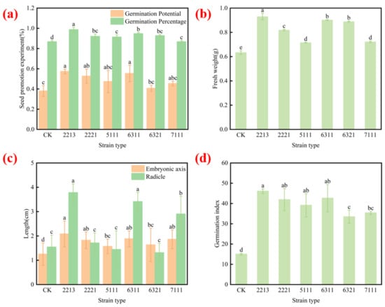 Figure 4. Effect of biocontrol microbial fermentation solution on the growth of pepper seedlings, where CK stands for no fermentation solution applied. (a) Seed germination potential and germination rate; (b) fresh weight; (c) lengths of embryonic axis and radicle; (d) germination index. Identical letters denote no significant differences between the respective groups (p > 0.05), whereas differing letters indicate a significant difference (p < 0.05).