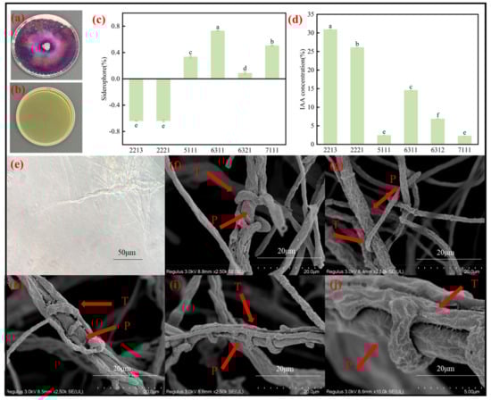Figure 5. (a,b) Bilayer plates inoculated with 6311 and not inoculated with fungi; (c,d) relative concentration of siderophores and concentration of IAA upon Trichoderma treatment, respectively; (e) 6311 (T) hyphae entangled in P. capsici (P) hyphae under a 400× optical microscope; (f,g) SEM images of 2213 (T) hyphae entangled in P. capsica (P) hyphae; (hj) SEM images of 6311 (T) hyphae entangled in P. capsica (P) hyphae. Identical letters denote no significant differences between the respective groups (p > 0.05), whereas differing letters indicate a significant difference (p < 0.05).