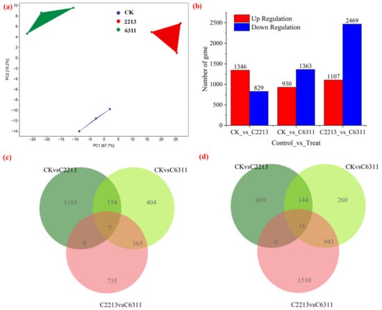 Figure 6. Sample correlations, and Venn diagrams of differentially expressed genes (DEGs). (a) The PCA for all samples; (b) the DEGs of all samples; (c,d) Venn diagrams of upregulated and downregulated DEGs, respectively.