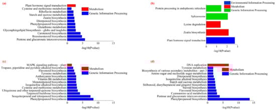 Figure 7. KEGG enrichment analysis of DEGs. (a,b) KEGG enrichment analyses of upregulated and downregulated genes in strain 2213 treatment, respectively; (c,d) KEGG enrichment analysis of upregulated and downregulated genes in strain 6311 treatment, respectively. Identical letters denote no significant differences between the respective groups (p > 0.05), whereas differing letters indicate a significant difference (p < 0.05).