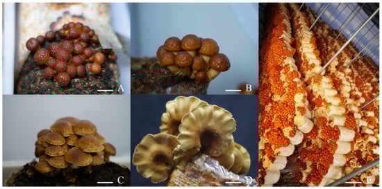 The cultivation conditions and primary processes involved in the development of the fruiting body of P.nameko ZZ1. (A) Primordium stage. (B) Growth stage. (C) Cap expansion stage. (D) Full maturity stage. (E) Mushroom cultivation in a greenhouse. Scale Bars = 3 cm.