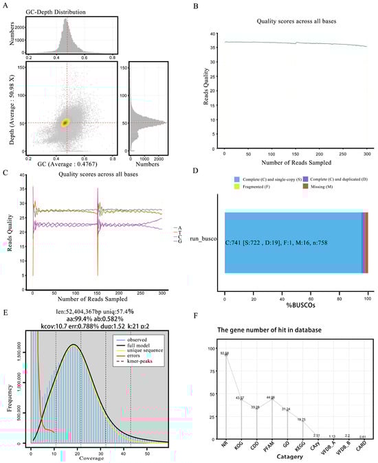 Comprehensive genomic quality and content assessment summary chart. (A) Genome gc-depth distribution chart. (B) Base quality distribution chart. (C) Single-sample sequencing base content distribution chart. (D) The BUSCO evaluation distribution bar chart. The bar chart shows the proportion of each component. (E) The survey assesses the k-mer distribution plot. The blue bars in the figure represent actual observed values. (F) Line chart of database annotation ratio.