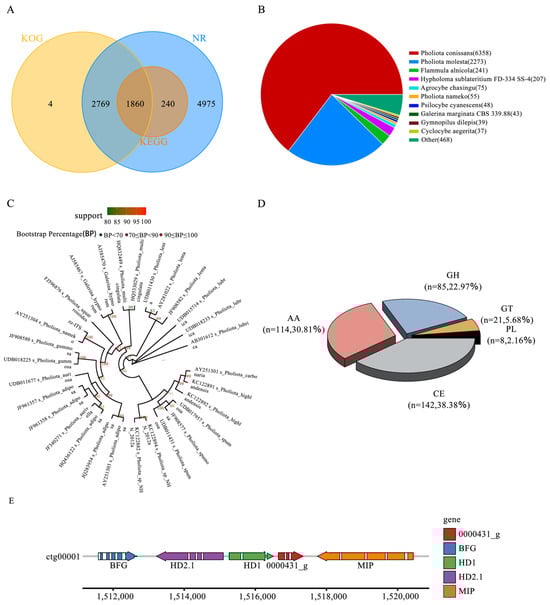 Gene annotation and homologous species distribution. (A) Venn diagram of gene annotations from databases. (B) Distribution pie chart of homologous species. Each sector in the chart represents a species, and the larger the area of the sector, the greater the number of sequences aligned to that species. (C) ITS-based circular phylogenetic tree. (D) CAZy Class classification. (E) A-mating-type site of P. nameko ZZ1.