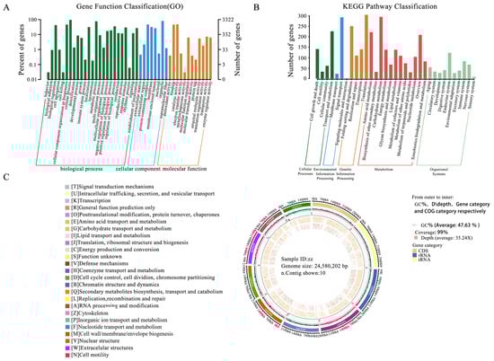 To achieve a comprehensive functional annotation of the ZZ1 strain genome, we utilized nine databases (including NT, NR (http://ncbi.nlm.nih.gov/, accessed on 1 December 2024), COG [] (https://www.ncbi.nlm.nih.gov/COG/, accessed on 1 December 2024), Swiss-Prot, TrEMBL, PFAM, CDD [] (https://www.ncbi.nlm.nih.gov/cdd/, accessed on 1 December 2024), GO (http://www.geeontology.org, accessed on 1 December 2024), and KEGG [] (http://www.kegg.jp, accessed on 1 December 2024) to perform sequence similarity analysis on 10,633 genes (Table S4). Our functional annotation of protein-coding genes in strain ZZ1 revealed significant functional diversity across the databases. We annotated 3322 genes in the GO database, with classification by biological process being the most prominent (Figure 4A). Additionally, 2100 genes were identified in the KEGG database, and these were associated with five pathway types, with metabolic pathways being most abundant (Figure 4B). To present the genome characteristics more intuitively, we employed Circos software (V 0.69-9) for a comprehensive visualization of the genome, encompassing information such as the GC content, sequencing depth, gene element content, and COG functional distribution (Figure 4C).