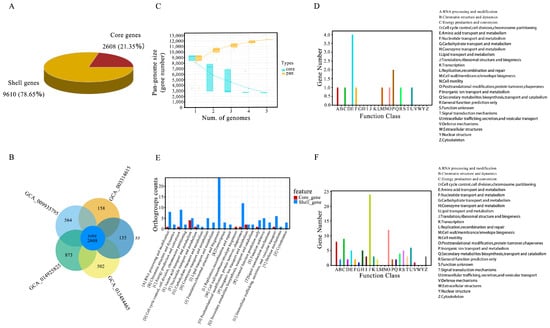 Comparative analysis and functional distribution of core and shell genes. (A) Pie chart of homologous genes categories. (B) Flower plot of homologous genes. (C) The accumulation boxplot of core/pan genes. (D) The distribution of core genes across different functional gene categories. (E) Comparative gene plot of core genes and shell genes. (F) The distribution of shell genes across different functional gene categories.