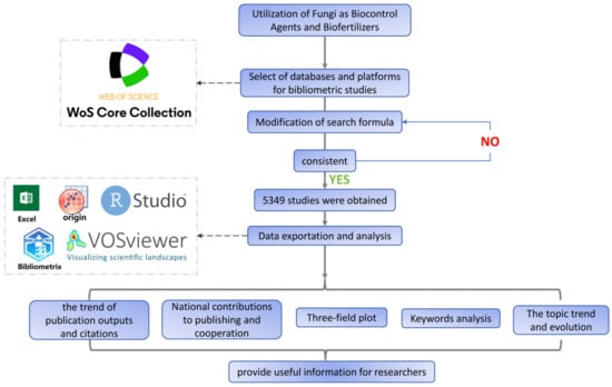 Beneficial fungi reduce the impact of chemical pesticides and fertilisers on the environment and improve plant health, growth, and nutrient absorption [5,30]. Bibliometrics is a robust analytical tool for measuring scholarly literature. Bibliometrics tracks the progress of research fields and facilitates the identification of emerging trends and challenges (Figure 1) [31,32,33]. Data visualisation plays a key role in presenting analytical results and converting complex, large-scale bibliometric data into intuitive and interactive graphics for various audiences [34,35]. Visualisation also enhances the understanding and interpretation of bibliometric analyses by highlighting patterns, trends, clusters, gaps, outliers, and relationships within the data [36]. Using a comprehensive bibliometric analysis and literature review, this study seeks to reveal the current application status and research trends of fungi as BCAs and biofertilisers. We explored the potential of various fungi and elucidated their mechanisms of action in the field. We introduced strategies aimed at enhancing the efficacy of these applications. This study provides prospects for future developments in this field.