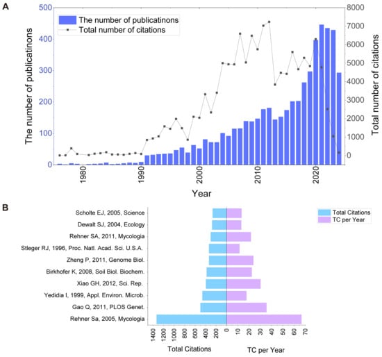 Literature publication and citations of fungi as BCAs and biofertilisers. (A) Number of publications on fungi as BCAs and biofertilisers and total citations per year, 1976–2024. (B) Total citations and average annual citations of the top ten most cited literatures on fungi as BCAs and biofertilisers [38,39,40,41,42,43,44,45,46,47].