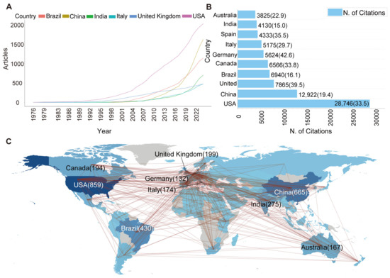 The citations of publications in each country highlighted that the USA (28,746) and China (12,922) had more citations compared to other countries (Figure 3B). The USA accounts for half of the top ten highly cited documents, further showing the USA’s vital contribution to this field (Table 1). Among the top ten countries with the most citations, Germany ranked first regarding the average number of citations (42.6). This demonstrates that the results obtained by German researchers have significantly impacted this field.