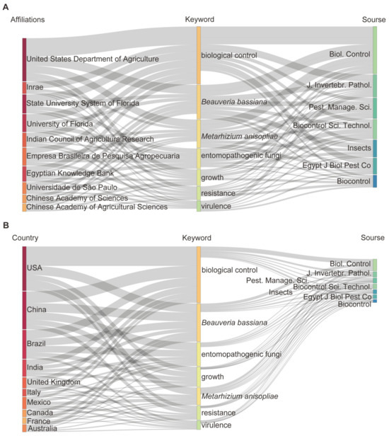Sankey diagrams offer an overview of the distribution of research topics across various institutions and countries and their preferred publication outlets, providing valuable insights into research trends and patterns (Figure 4). The results showed that the core research topics in the field included biocontrol, B. bassiana, M. anisopliae, entomopathogenic fungi (EPF), growth, resistance, and virulence (Figure 4A). Notable institutions contributing to this research include the United States Department of Agriculture (USDA), State University System of Florida, and University of Florida (Figure 4A). In addition, Biocontrol, Journal of Invertebrate Pathology, Pest Management Science, and Biocontrol Science and Technology were the preferred journals for publishing research on BCAs and biofertilisers (Figure S2). Overall, 14.8% of the journal articles were related to these fields (Figure S3). The aforementioned research institutions and academic journals encompass a comprehensive array of relevant subjects related to BCAs and biofertilisers (Figure 4A). The USDA predominantly publishes its research findings in renowned journals such as Biocontrol, Journal of Invertebrate Pathology, and Pest Management Science. The USA and China have led the field of biocontrol, focusing on the study of EPF, B. bassiana, and M. anisopliae (Figure 4B). The scholarly achievements of those nations are predominantly featured in biocontrol journals.